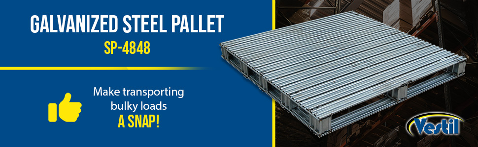 Heavy-duty non-reversible welded steel pallets. Usable fork openings are 3-7/8" high. Model SPL-3636 has 4-way entry allowing for access for both fork and pallet trucks. Models SPL-4048, SPL-4248 and SPL-4848 have 2-way entry and allow access for fork trucks only. Hot-dipped galvanized finish offers rust resistance.