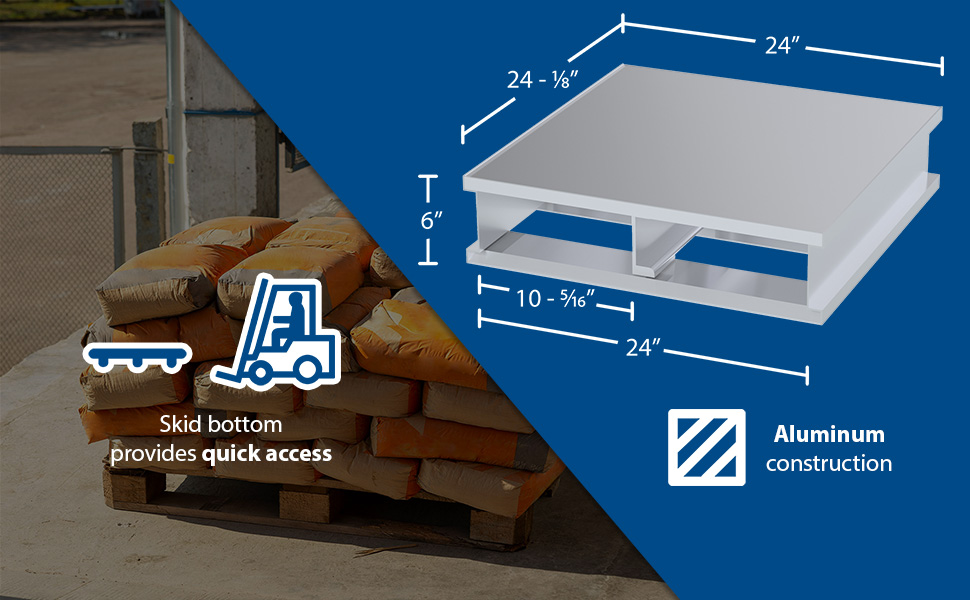 | Aluminum Half Solid Top with Skid Bottom 24 In. x 24 In. x 5-1/16 In. 4000 Lb. Capacity Silver | Uniform Capacity: 4000 Fork Pocket Width(in.): 19.5625 | 17 |