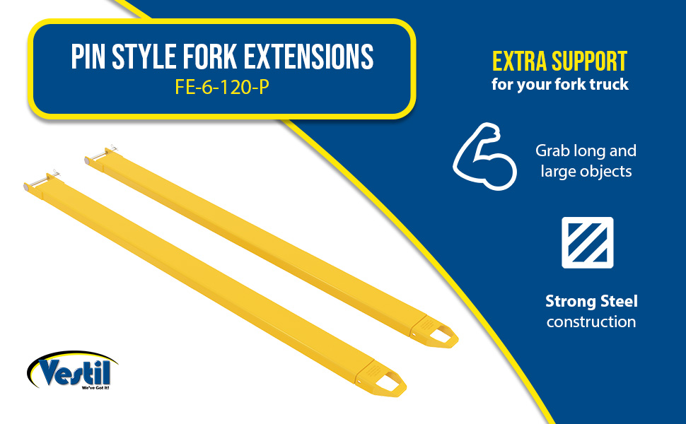 FE-6-120-P FE-6-120-PSteel Pin Style Fork Extensions 6 In. x 120 In. 4,000 Lb. Capacity YellowUniform Capacity Per Pair (lb.): 4,000