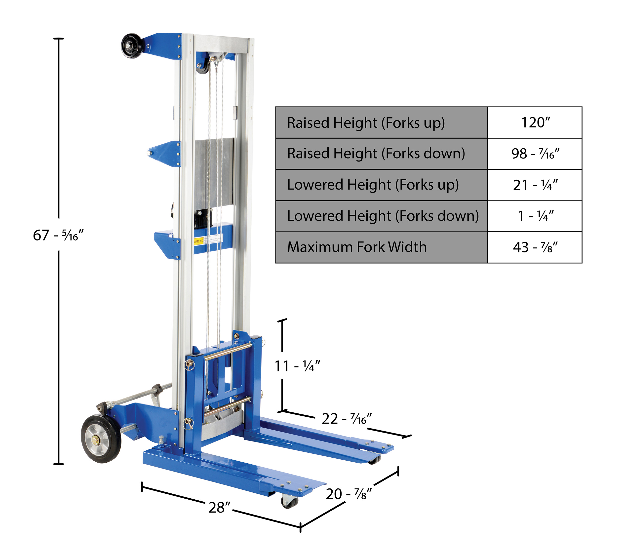 Raised Height with Forks Up (in.): 120 Fork Width (in.): 4 Fork Height (in.): 1-3/4