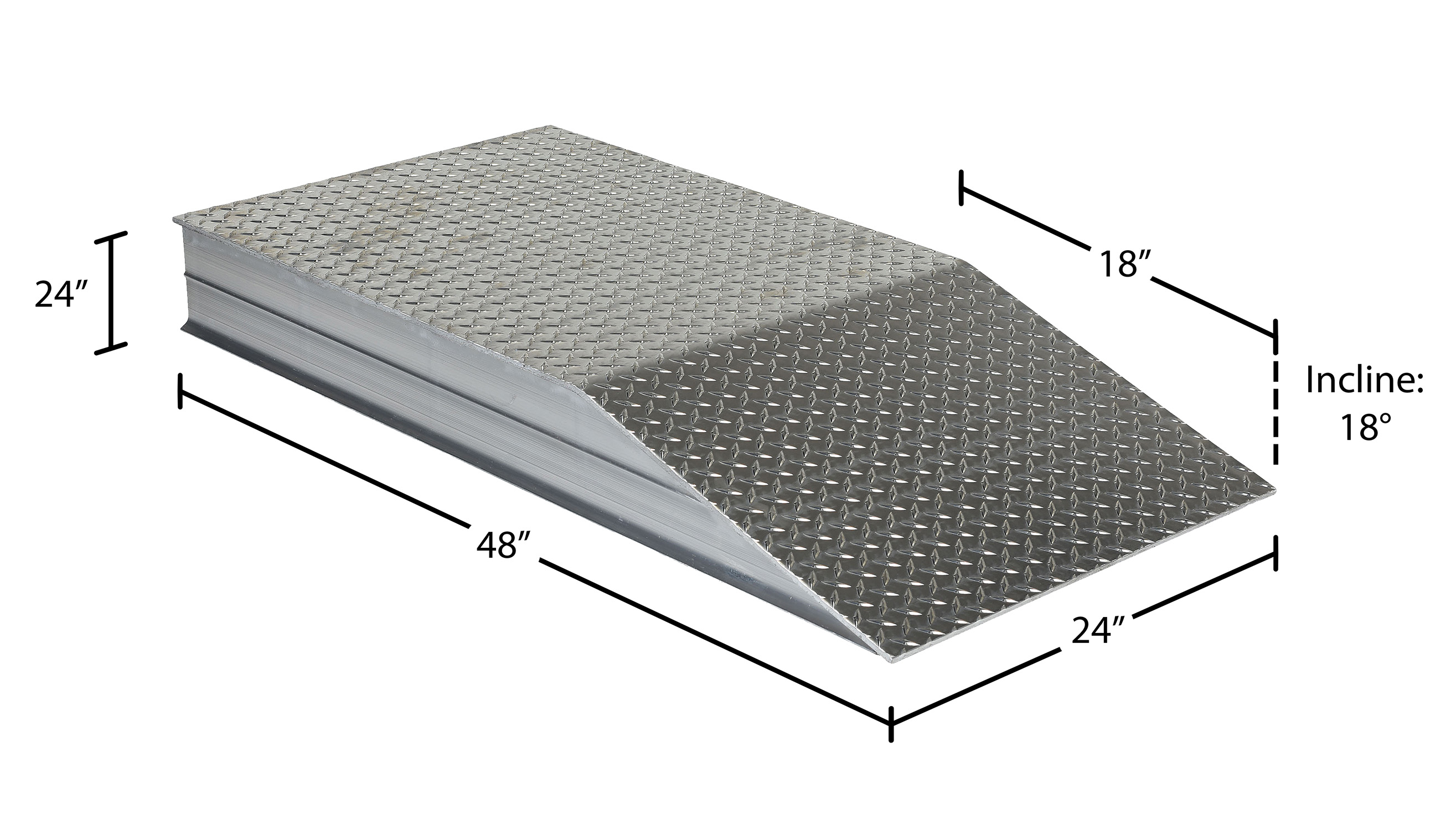 Elevate semi-trailers to loading docks for maximum serviceability during loading and unloading operations. Manufactured from heavy-duty aluminum tread plate for positive traction. All welded aluminum construction. 30,000 lbs. uniform capacity per pair (1/4" thick material). Wheel risers are designed to raise the trailer for secure loading and unloading.