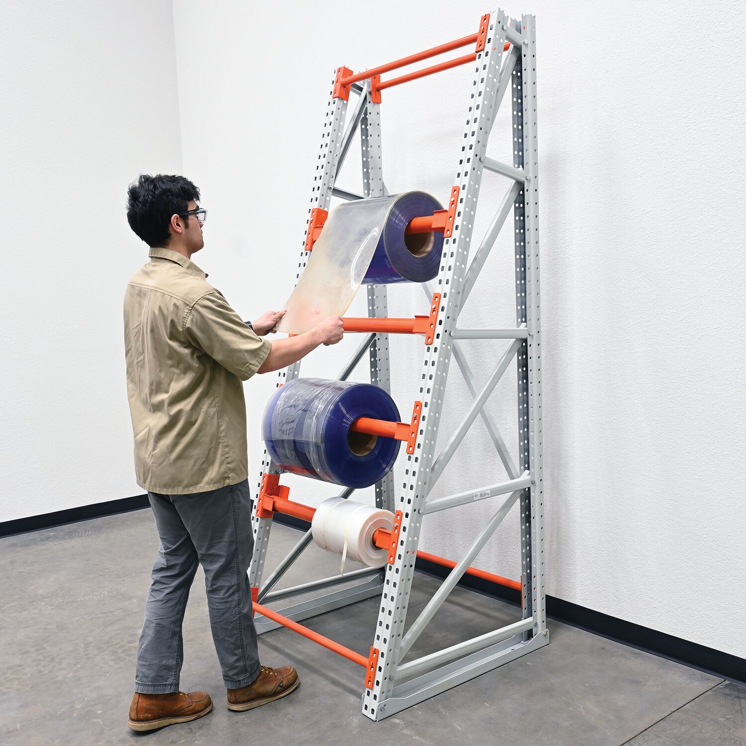 Steel Reel Rack Starter Kit 36 In. x 39 In. x 96 In. 6000 Lb. Capacity White/OrangeDo you want to dispense material from a reel carefully and efficiently? Then get yourself a reel rack! It's perfect for reels of wire rope, hose, electrical cable or even chain! Not only are the reels dispensed quickly, but they can also be stored right on the rack! With help from the changeable brackets, the arms can be staggered along the frame for different size reels. Unit must be secured to floor.
