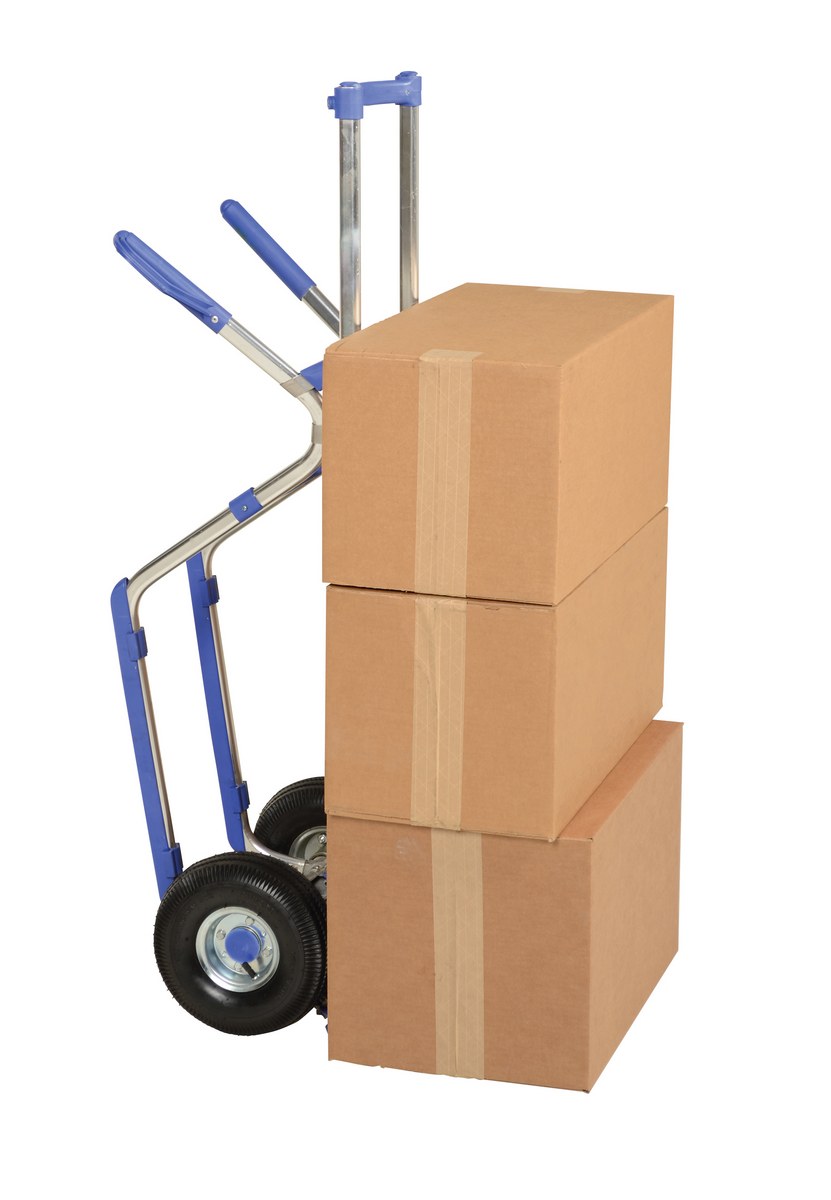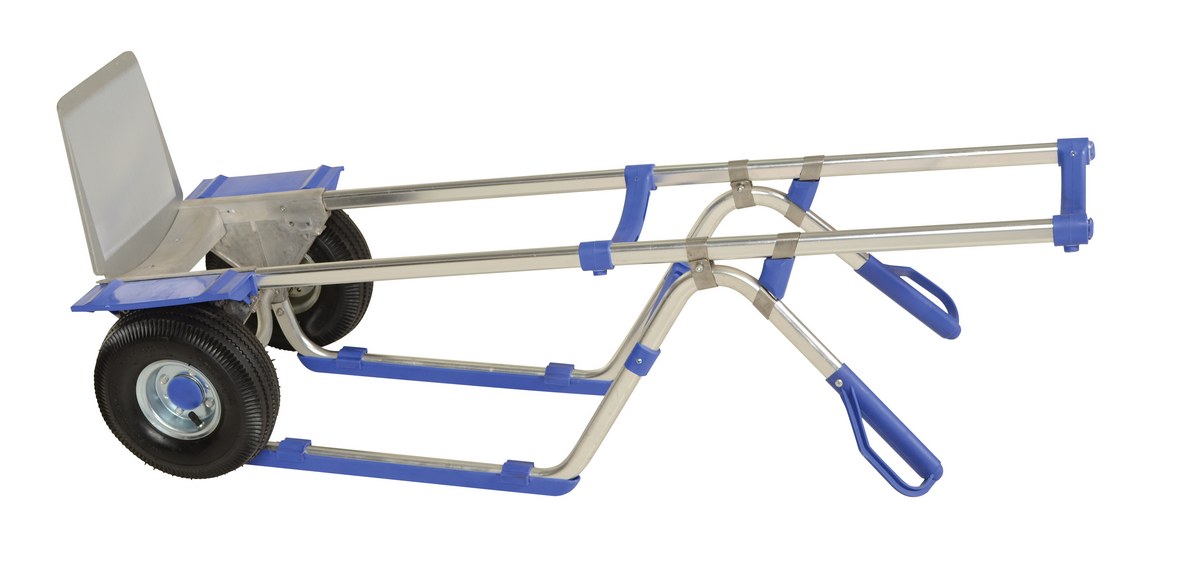 Heavy-duty construction, yet lightweight aluminum design, provides superior control. This unit has knuckle guard handles, fold up nose plate, and curved back plate for transporting cylindrical objects. Transporting down stairs or steep hills is no problem with this unit. 10" x 3-1/2" pneumatic wheels are standard. Ships fully Assembled.