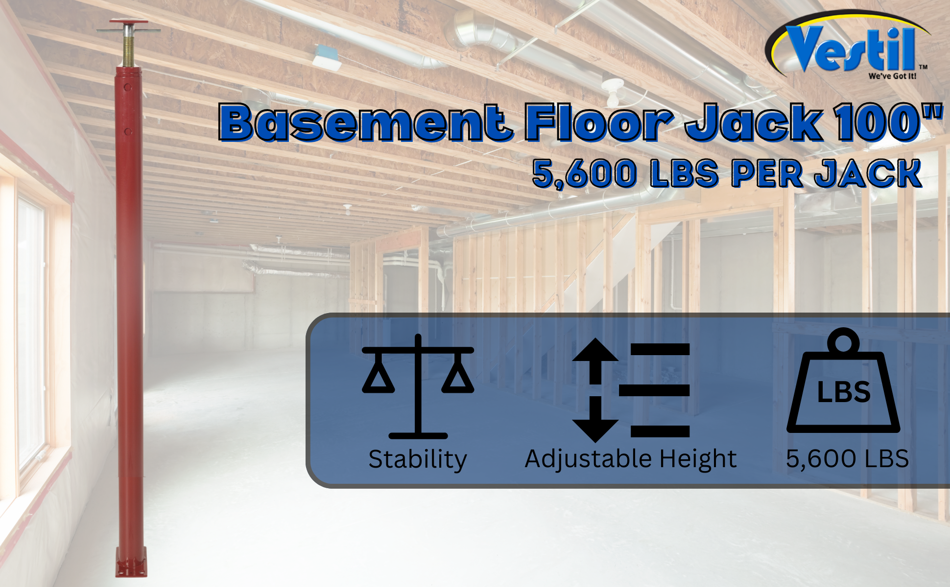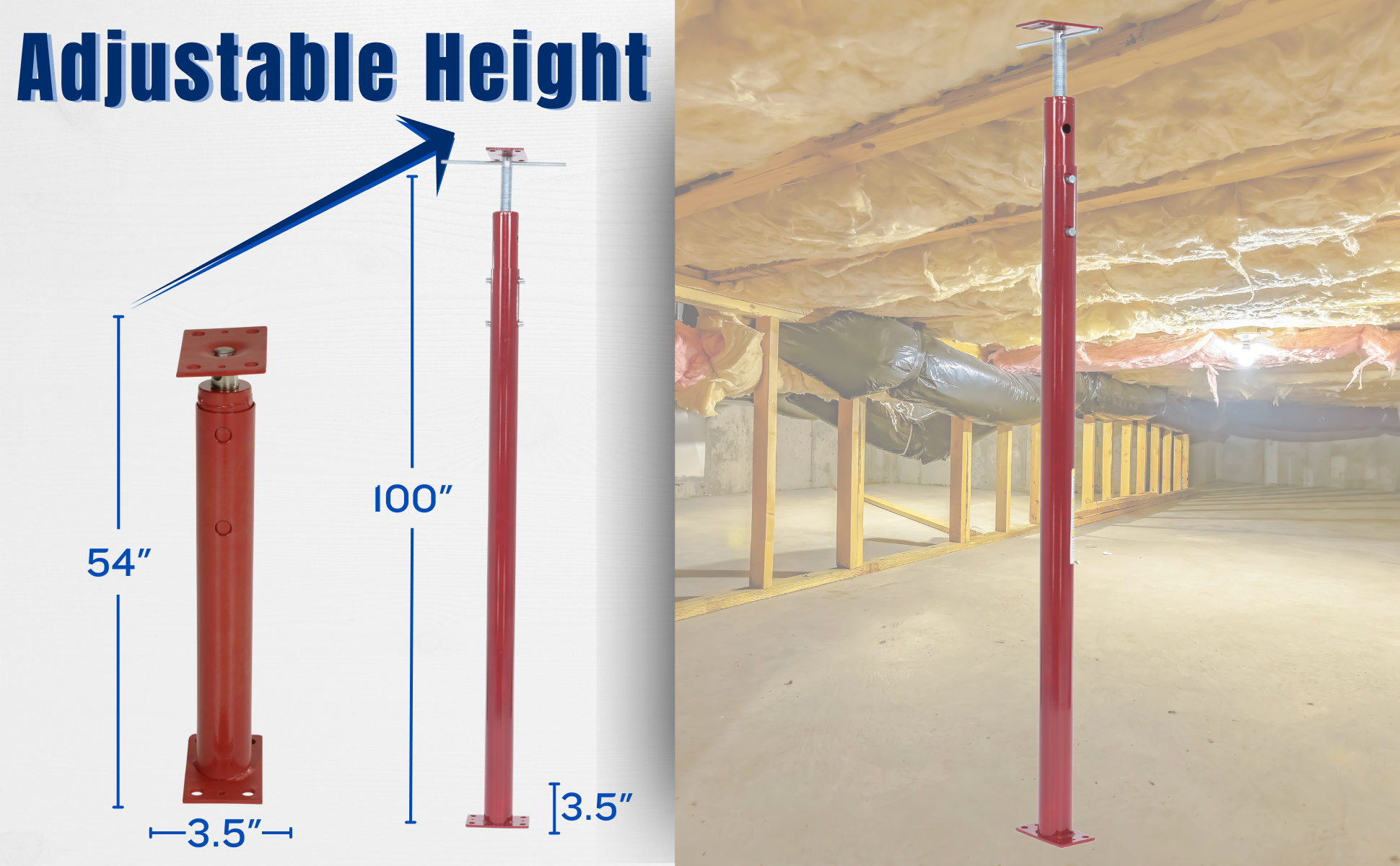 FJB-100 FJB-100Basement Floor Jack 100 In. Maximum Height 5,600 Lb. Capacity RedHeight Minimum/Maximum (in.): 54 to 100