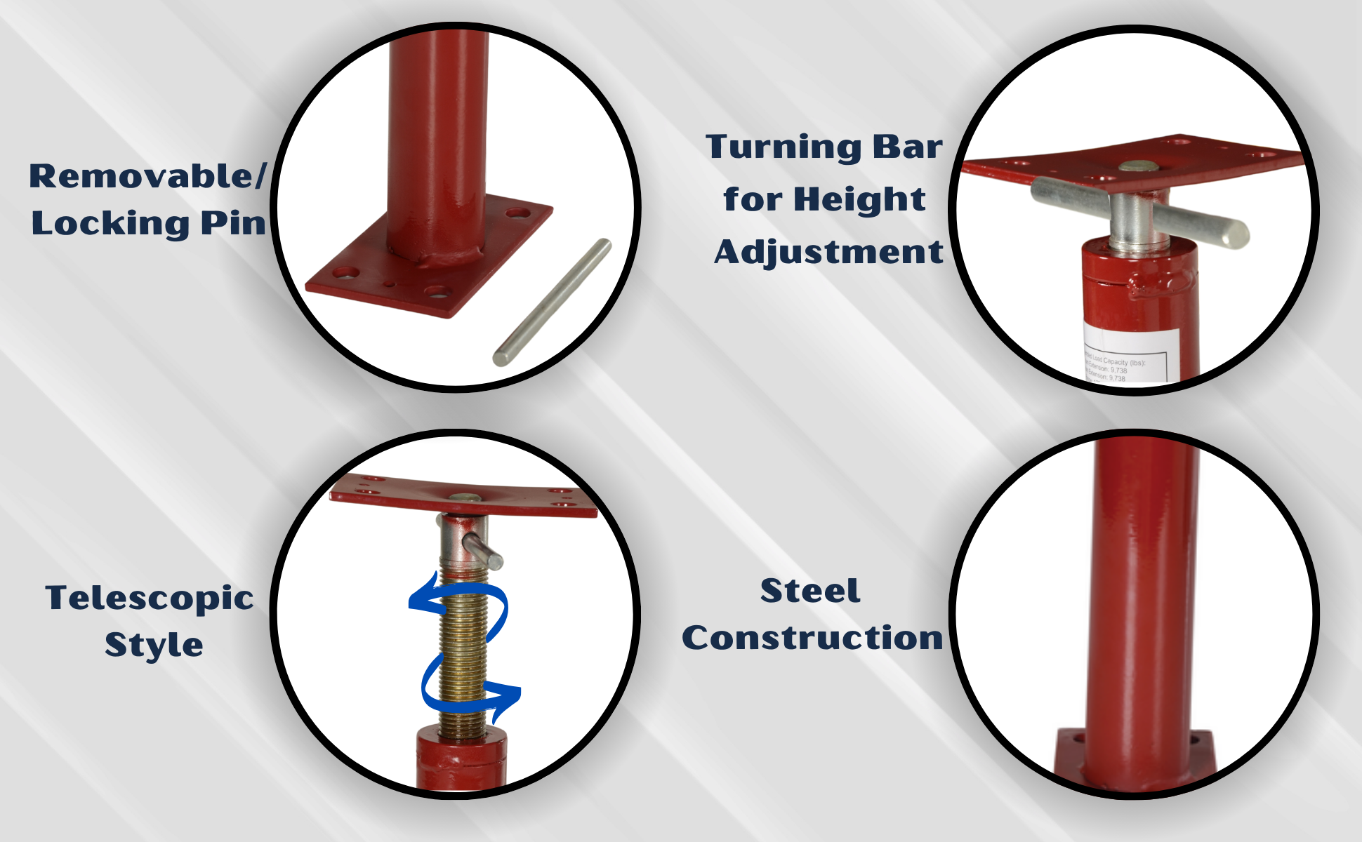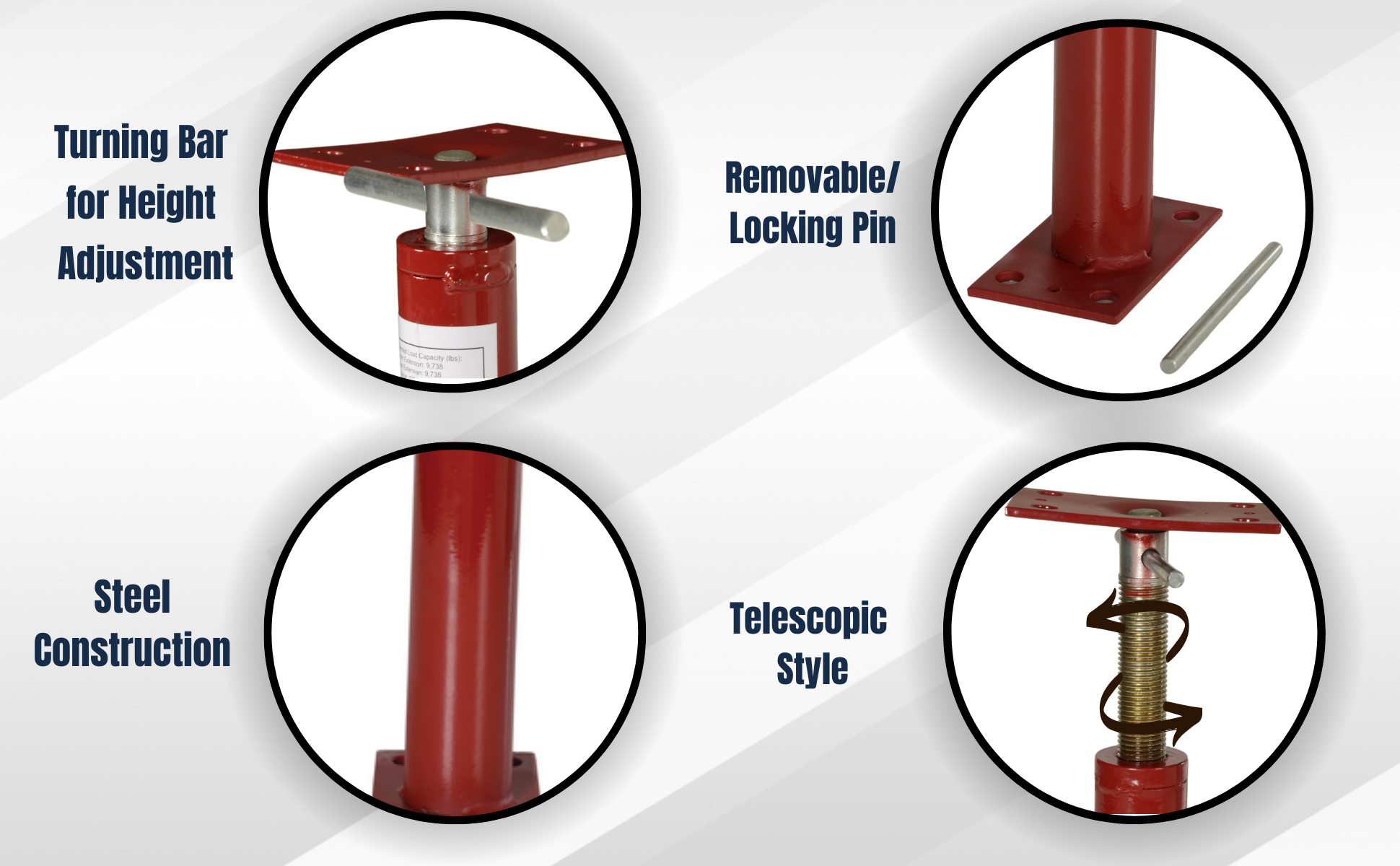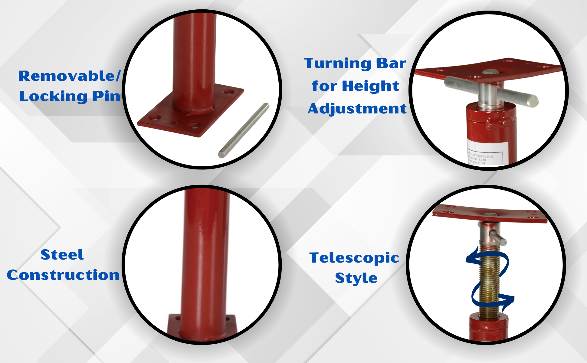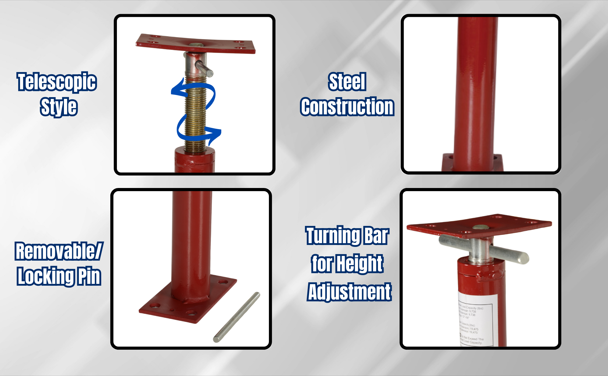 • Includes locking pins and turning bar for easy height adjustment