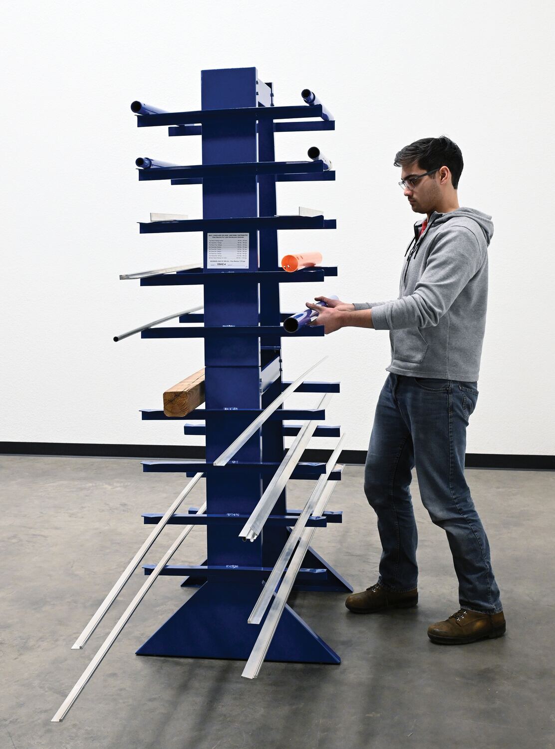 Ideal for use in maintenance departments, tool rooms, machine shops, and storage areas. Arms extend and act as dividers creating bays of storage. Nine arm levels can store material up to 10 feet long. Aligning two units next to each other will allow for the storage of longer material. Arm edges are sloped upward to prevent roll off's. Arms are welded at 6" increments with 6" between levels. Total uniform rack capacity is 2,600 pounds evenly distributed. Unit has predrilled lag down points and ships knocked down. Steel construction with baked-in powder-coated toughness.