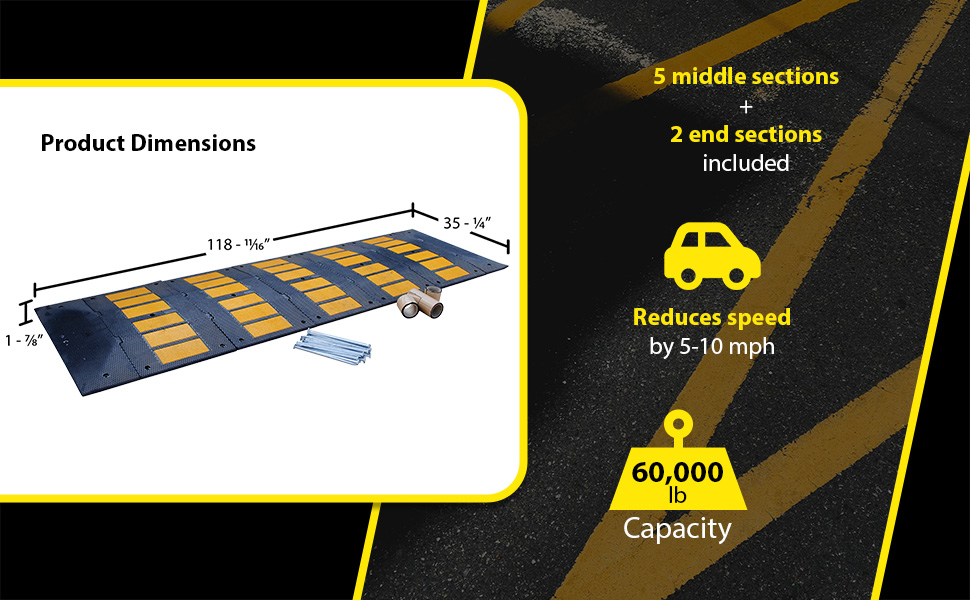 RSH-120-36-A RSH-120-36-ARubber Speed Hump Asphalt Hardware 118-11/16 In. x 35-1/4 In. x 1-7/8 In. 60000 Lb. Capacity Black / YellowUniform Capacity (lb.): 60,000