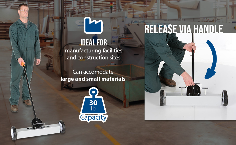 Magnetic Sweepers are ideal for manufacturing facilities and construction sites. The sweeper is ergonomically friendly with an efficient handle controlled release. The design and capacity can accommodate large and small materials. While the standard handle allows for comfortable upright position during use, the wheels allow smooth rolling for quick and easy collection of objects.