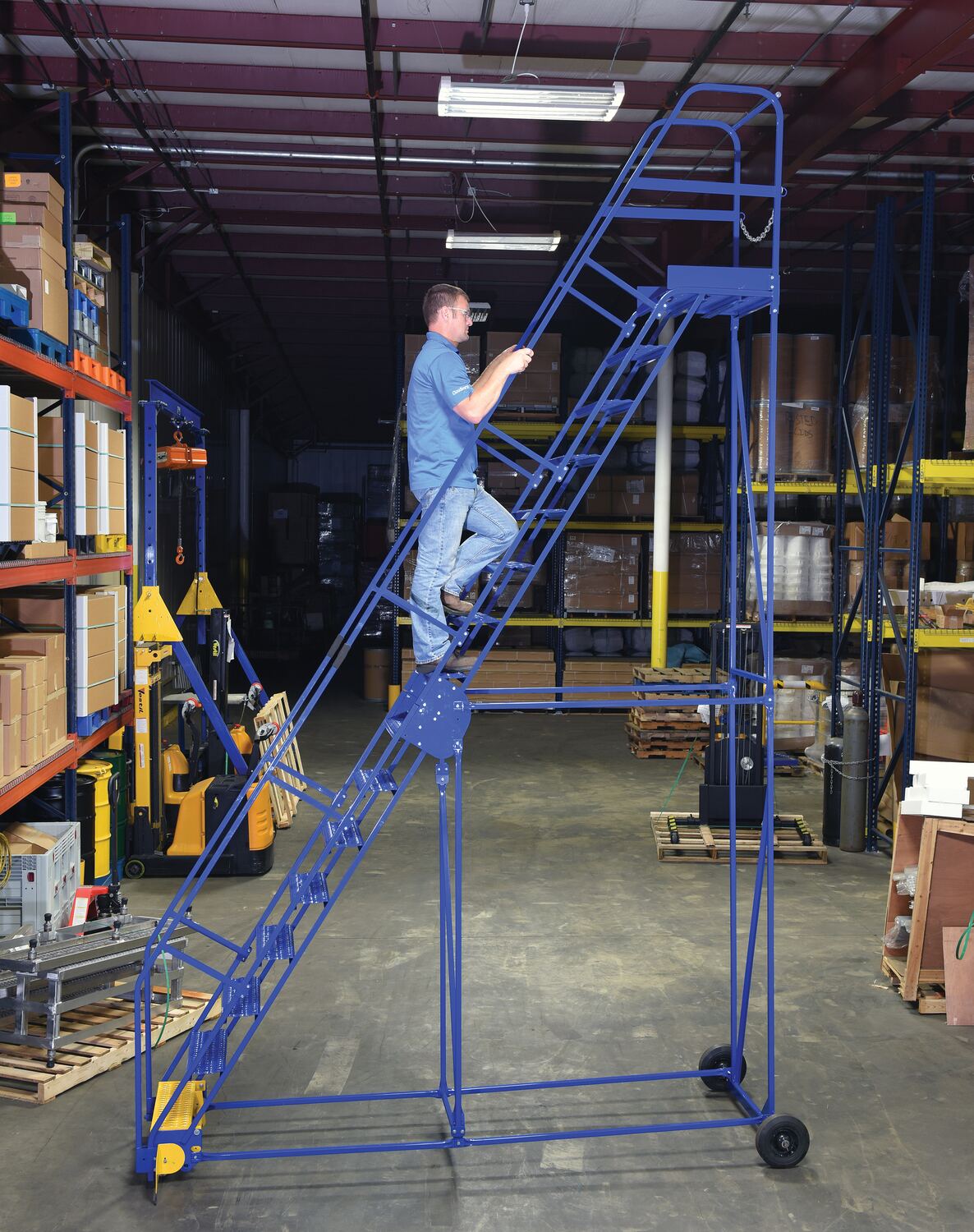 LAD-14-21-G-EZ LAD-14-21-G-EZSteel Rolling Warehouse Ladder 50 Degree 14 Grip Strut 23-9/16 In. Step Width 350 Lb. Capacity BlueUniform Capacity (lb.): 350