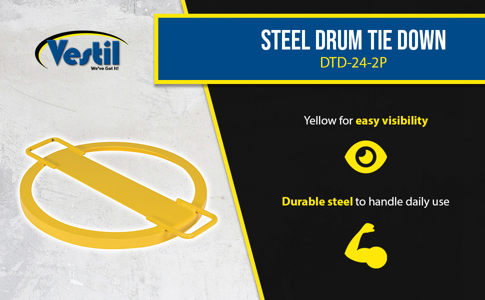 This drum tie down is a great asset for both work and home. The tie-down has a 24" diameter creating a snug fit over the top of a 55 gallon drum. Once in place, the two attachment points can be utilized to help secure the drum to the bed of a truck or other transporting vehicles with assistance of cables or straps. Cables and straps not included. The strong steel construction withstands the wear and tear of daily use, while the highly visible yellow finish provides a smooth surface for safe handling. When not in use the unit is storable due to its low profile, compact design. Baked-in powder-coated toughness.