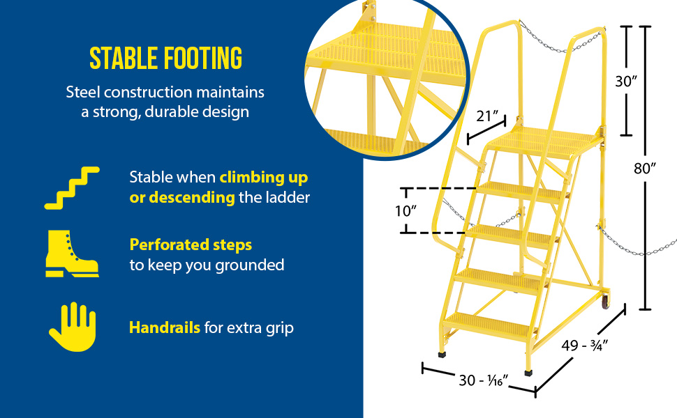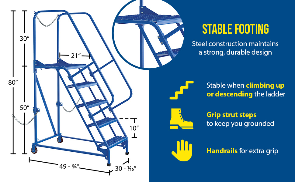Semi-Trailer Access Ladders are for use getting into Semi-Trailers. Tilt the unit to allow for portability. Units roll on 4" poly-on-poly wheels. Constructed of square tubing framework which handles uniform capacities up to 350 lbs. Features 30" high removable hand railing, access chain, 21" deep top platform, and an industrial baked-in blue powder coat finish for toughness. Each step measures 24" wide by 7" deep and is spaced 10" apart. Climb Angle is 58 degrees. |
