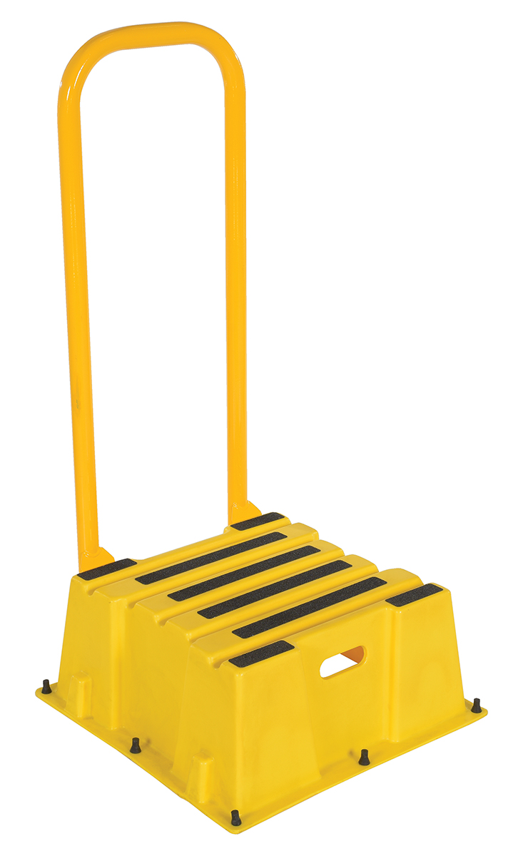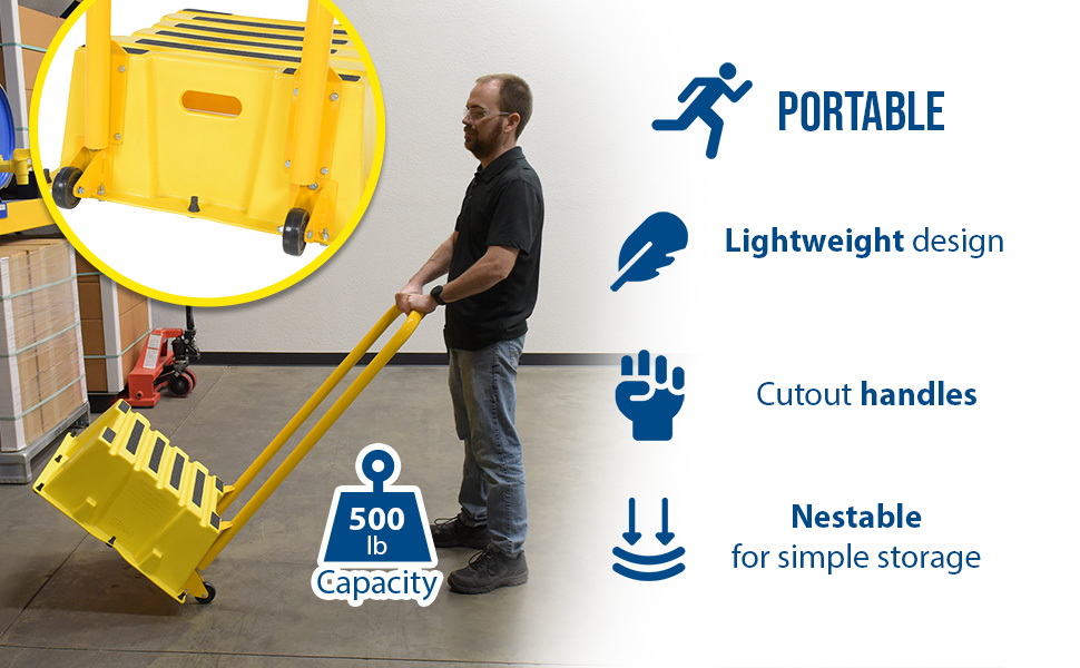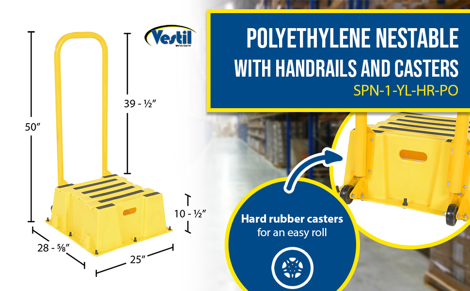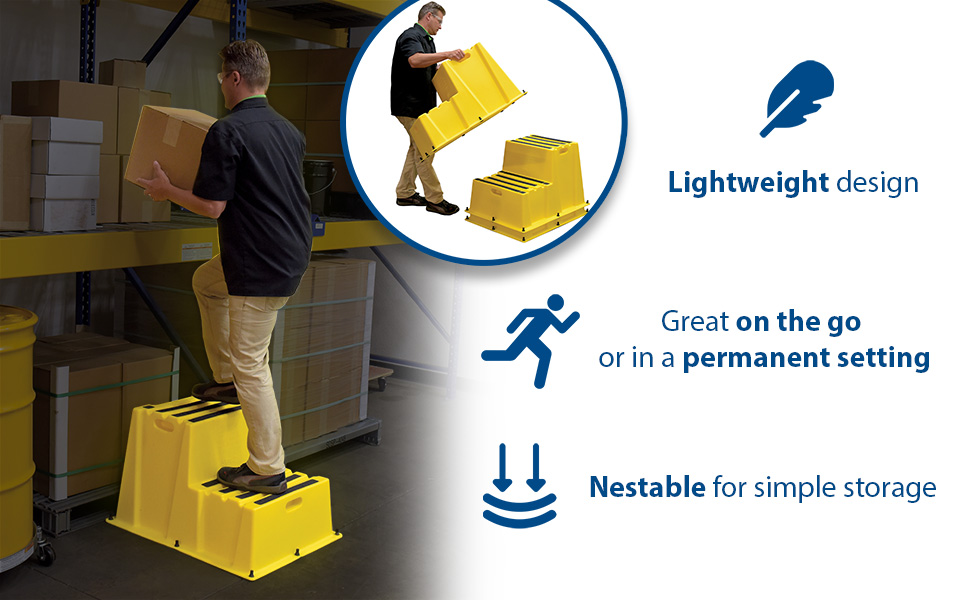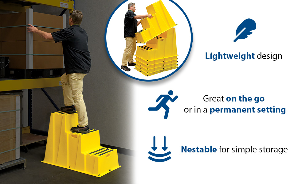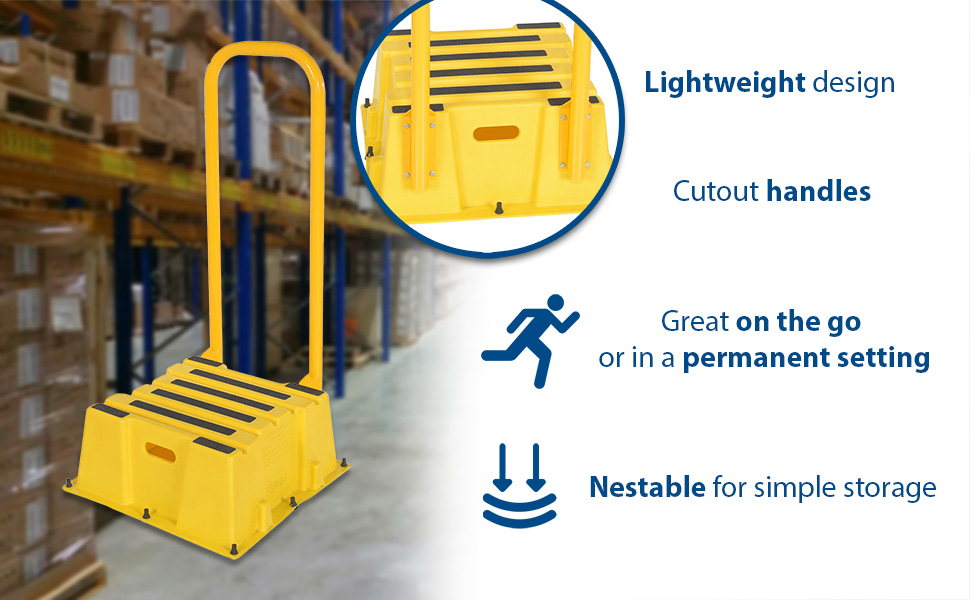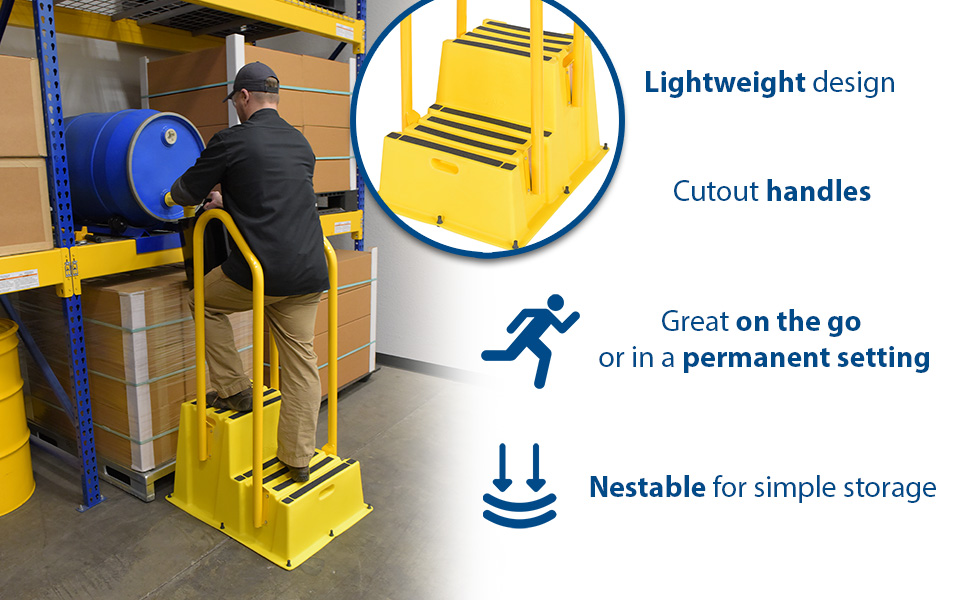 A poly step stool is a great asset for on the go or in a permanent setting. A lightweight design with front and side cutout handles, allow the user to easily transfer the stool to a preferred spot. The taped step surfaces ensure safe footing while traversing up and down the steps. Includes bolt on handrail and casters. The hand rails height allows the unit to be pushed or pulled into the desired position, minimizing bending and twisting by the user. Steps can be nested to minimize footprint when not in use.