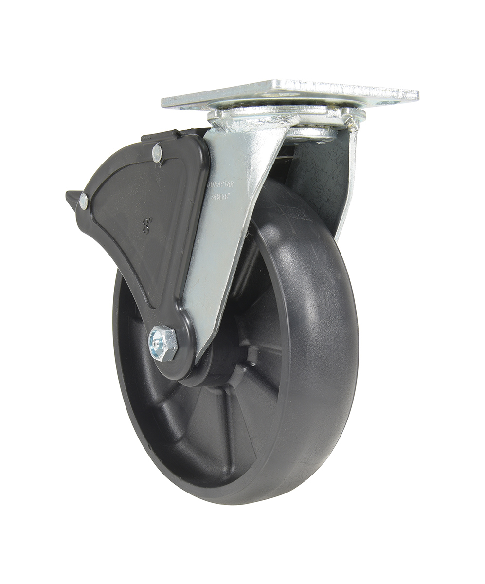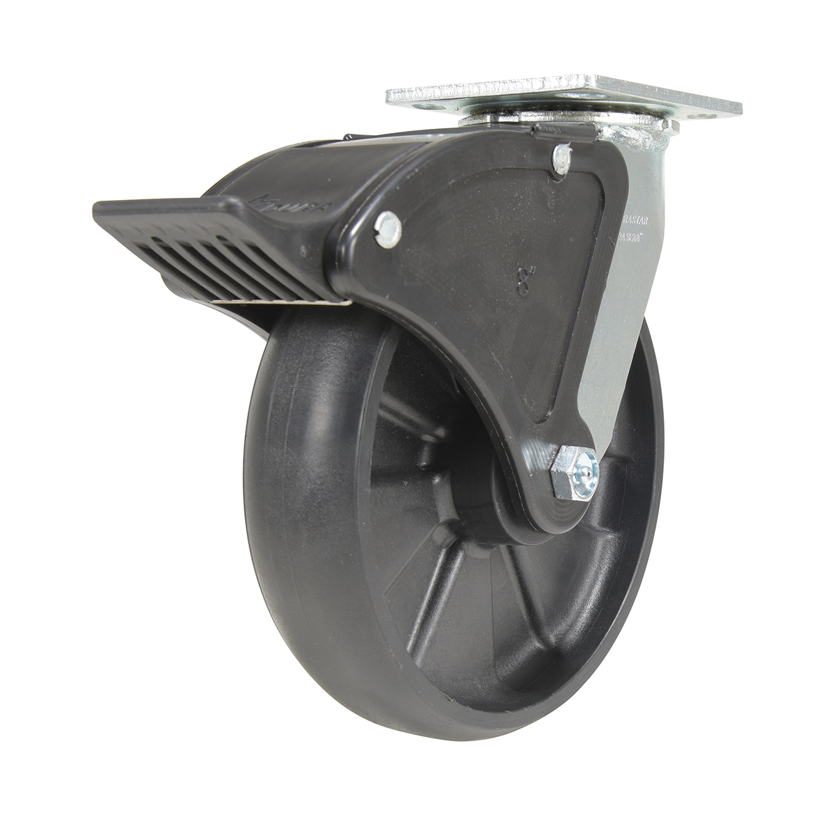 These glass filled nylon casters are constructed of a thermoplastic compound that is perfect for industrial and institutional applications. Resistant to most chemicals, salts, solvents, and steam. This tread does not absorb water and is non-marking. Black tread color. Wheel core is glass-filled nylon. 65 +/-5 Shore D.