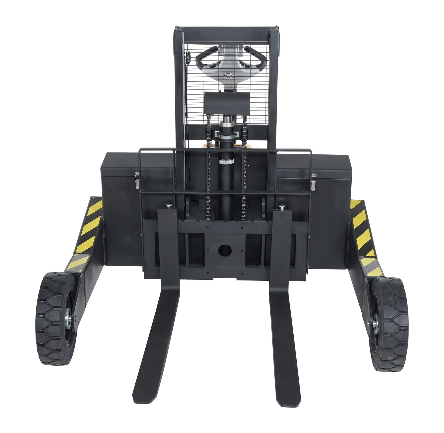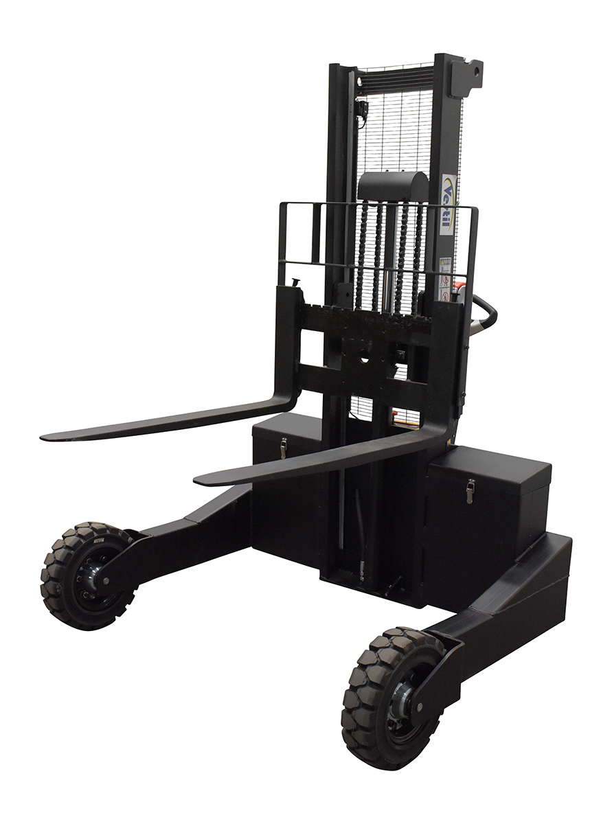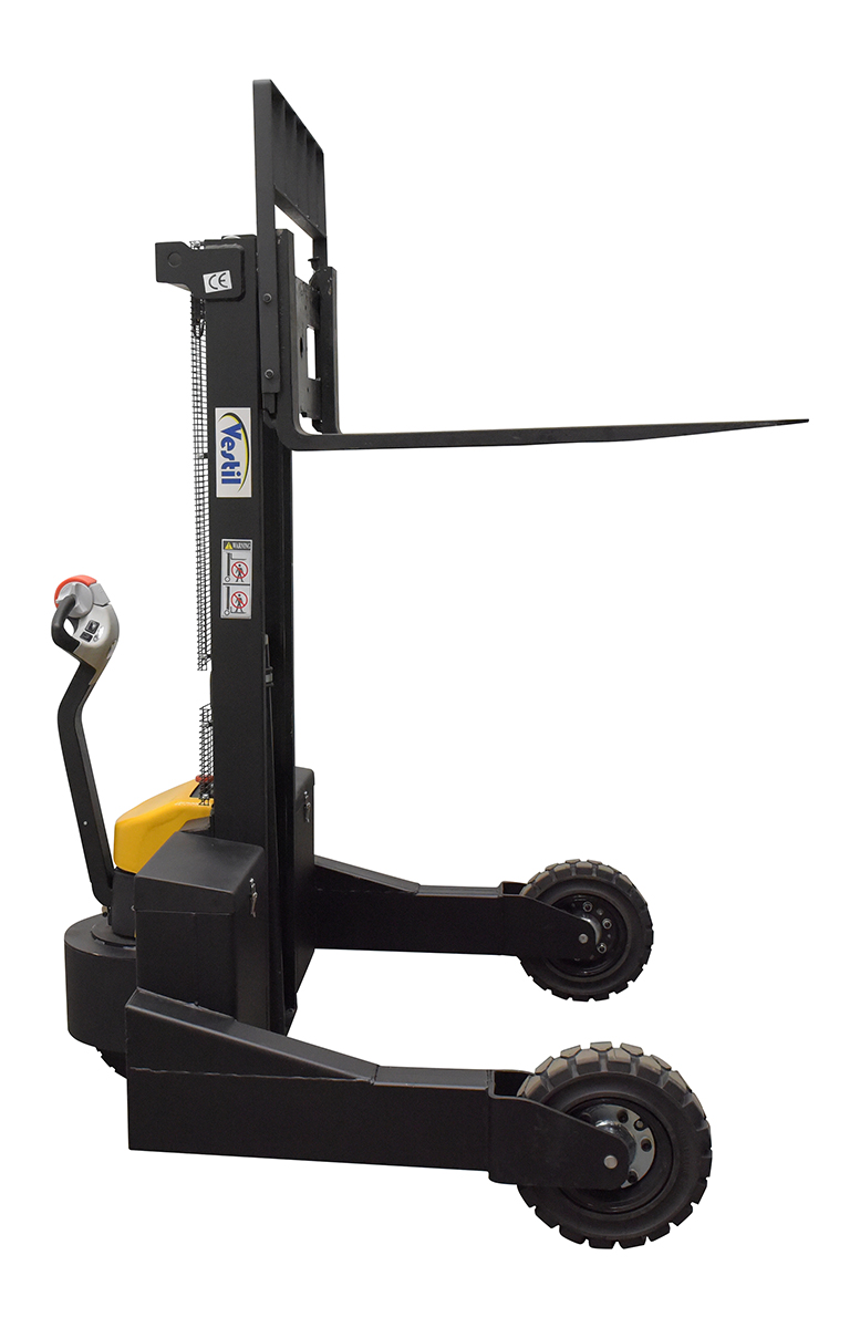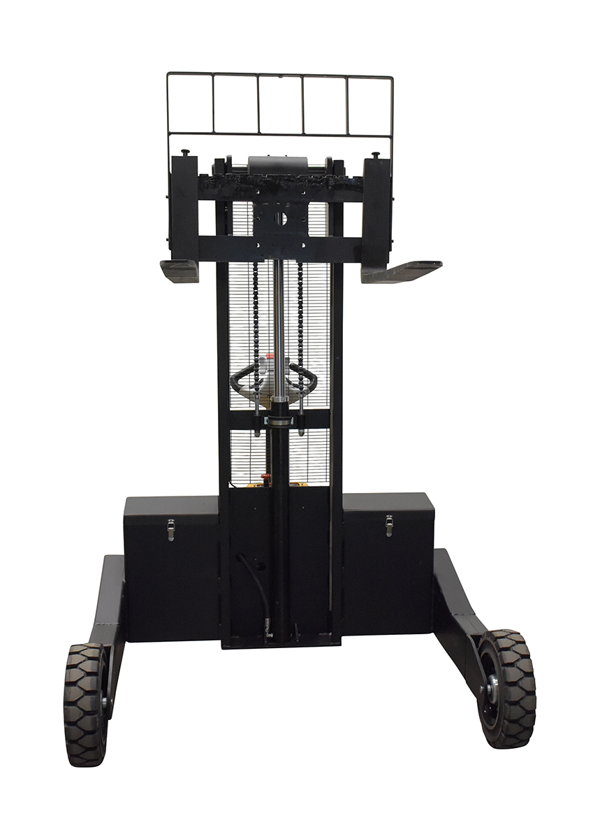 When goods have to be transferred over uneven and rough surfaces, look no further than the electric powered rough terrain stacker. With its large front and back rubber tires this unit can easily be used both indoors and out. A multi-function driving handle features an infinite speed adjustment, simple controls for finding the perfect height, and an emergency reverse function. Forks are adjustable to precisely fit what is being maneuvered. And, even more, the unit is equipped with batteries, integral battery charger, and battery level indicator.
