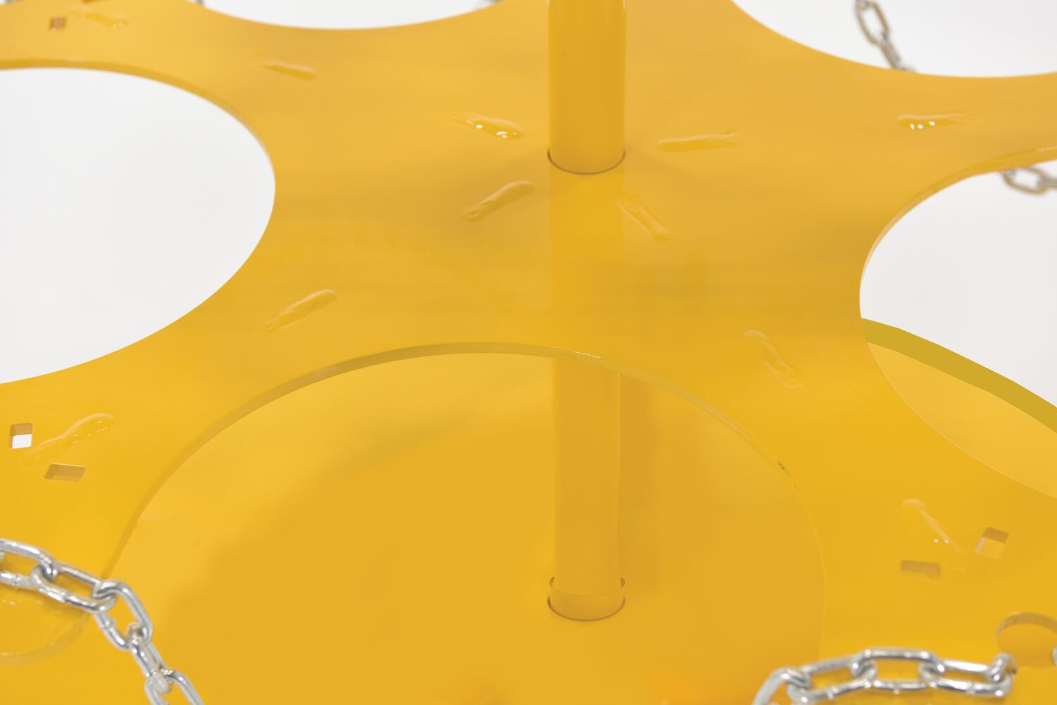 A Pail carousel rack is a quick way to transfer loaded and unloaded pails. Each bay is a perfect fit for a 5 gallon pail, while an included safety chain gives an extra level of security. The carousel design enables circular movement of each tier, allowing the user to maintain their position instead of moving to each individual pail bay. The rack is constructed of 1/4" thick powder coated steel.
