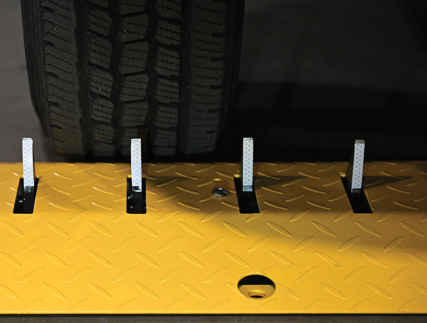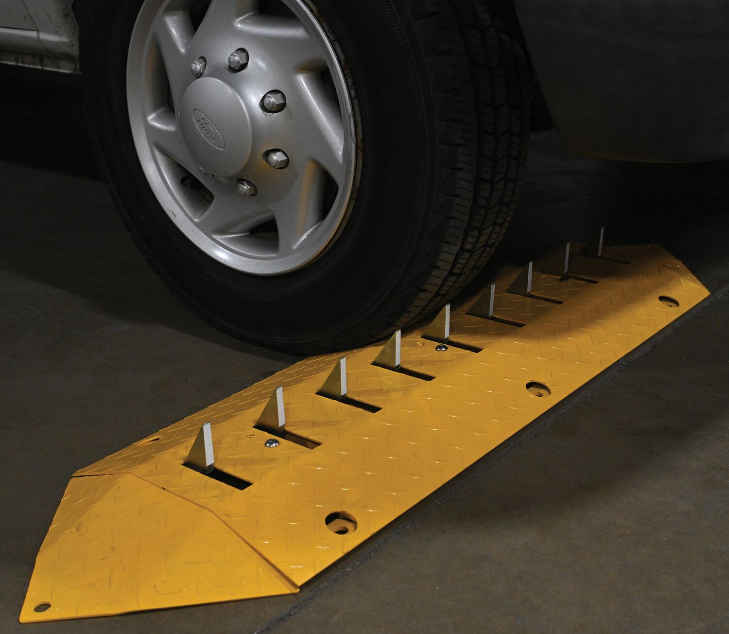 TSPIKE seriesA spiked speed bump is an easy way to control the movement of traffic, while deterring vehicles from entering and exiting in the same lane. With a retractable spiked design, the speed bump allows traffic to flow only in a single direction. When the vehicle enters in the correct direction the spikes will submerge into the construction of the bump allowing the vehicle to pass unobstructed. If the vehicle were to exit using the same lane, the spikes will not retract but continue to stand tall.
