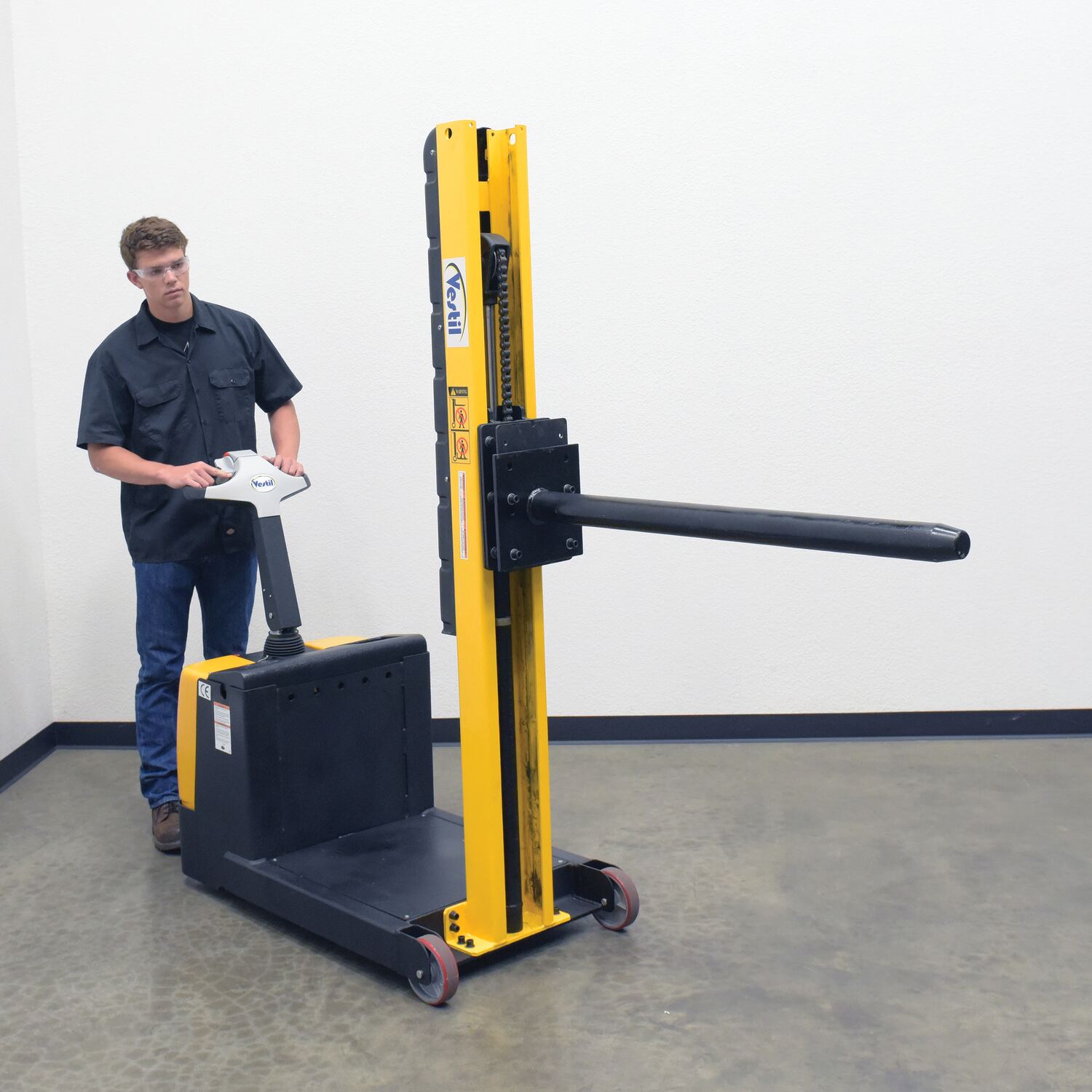 Counter balance stacker with a narrow mast design is ideal for die loading, machine feeding, and for loading and unloading trucks in confined areas. An ergonomic handle features easy-to-operate throttle with infinite adjustment of forward and reverse speeds, lift/lower controls, and emergency reverse function. Multiple attachments available. Includes an automatic dead-man feature that activates when the user releases the handle. Also included are batteries, an integral battery charger, and battery level gauge. Easy access battery compartment simplifies battery maintenance.