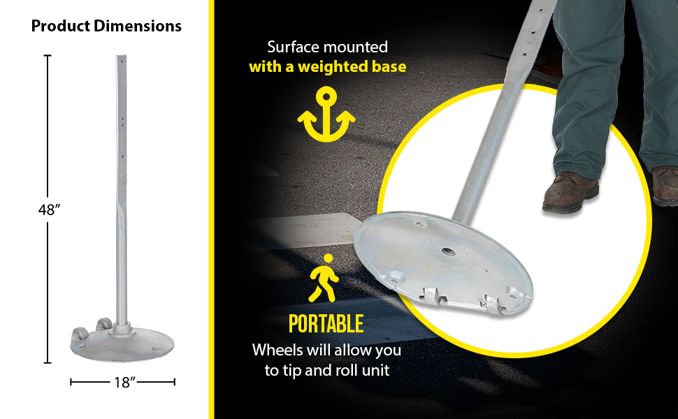 Display your signs anywhere. Surface mounted with a weighted base. Includes (3) holes, 9/16" diameter with 1-3/8" diameter counter-bore for permanent mounting of sign. Removable post will accept virtually any sign (sign & mounting hardware not included). Steel construction with painted bright zinc finish.
