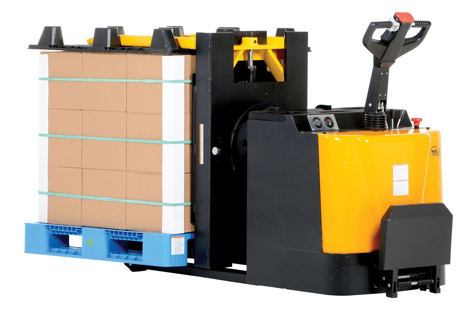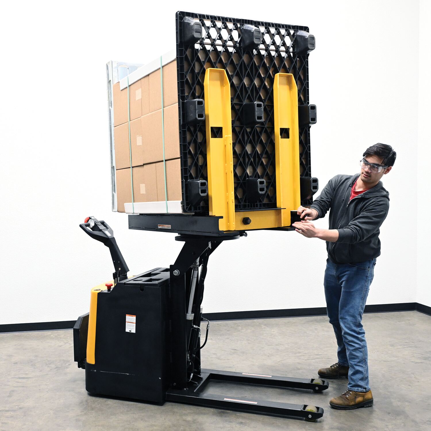 Tilt (powered) and rotate (manual) loads with our durable Pallet Inverter. Low profile design allows the operator to stand on the rider platform and steer the load from workstation to workstation quickly and easily. DC power lift and drive makes operation safe and efficient. The ergonomic handle features easy to operate throttle with infinite forward and reverse speeds, tilt/lower controls, safety belly reverse button, and horn. Features an electromagnetic disc brake with automatic dead-man feature that activates when user releases handle. Includes (4) 6V batteries, an on-board battery charger, battery level gauge, emergency battery disconnect, and horn. Ideal in loading dock areas as a powered pallet truck, powered pallet tilter, or as a manual turntable. Rolls smoothly on polyurethane steer and load wheels.
