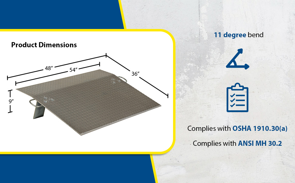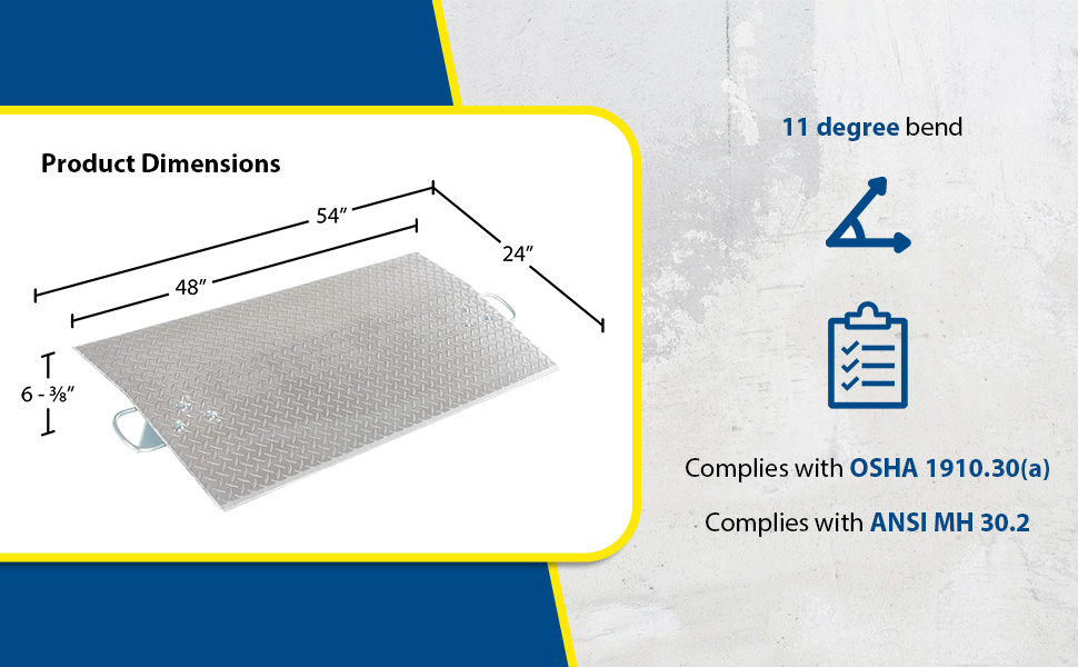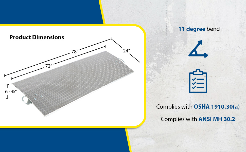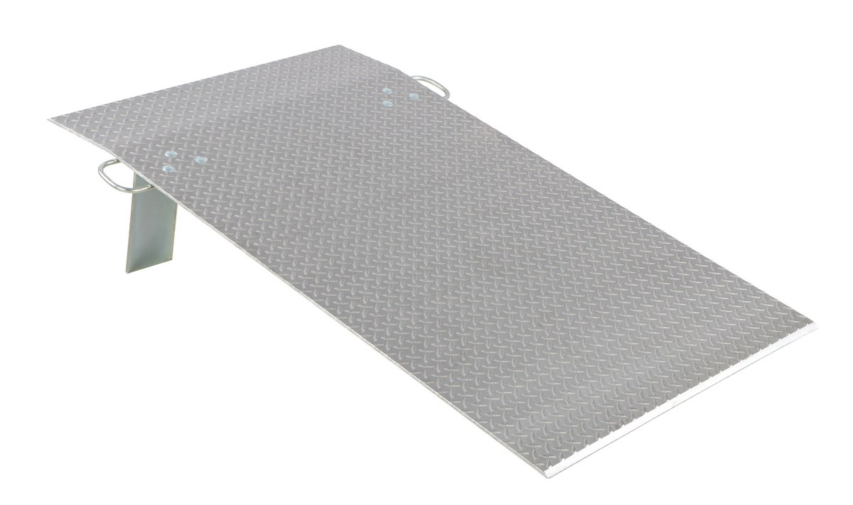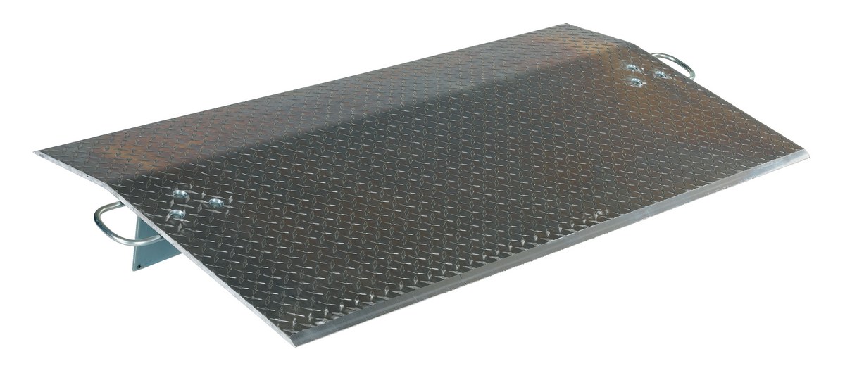 Aluminum Economizer Dockplates are an economical way to speed up truck loading and unloading. Spans the opening between the dock and trailer to allow pallet or hand trucks, along with pedestrian traffic to safely move in and out of the trailer. The dockplate is constructed of high strength, non-skid aluminum alloy tread plate. The lightweight design with bolt-on zinc plated legs and handles on each side makes portability easy. Locking legs for OSHA compliance. The bend or crown is 11 degrees and located 9" from edge of dockplate. Not for use with fork trucks.