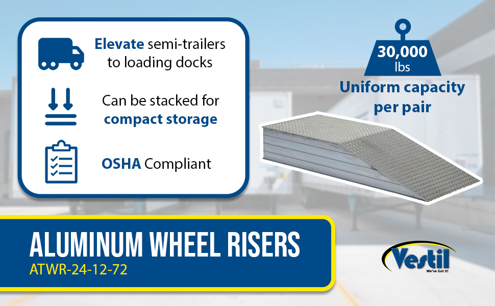 ATWR ApplicationElevate semi-trailers to loading docks for maximum serviceability during loading and unloading operations. Manufactured from heavy-duty aluminum tread plate for positive traction. Welded all aluminum construction. 30,000 lbs. capacity per pair (Sold Each). Wheel Risers are designed to raise the trailer for loading and unloading to facilitate compliance with OSHA/ANSI B56.1 part 3 sec 7 requirements for a maximum grade of ascending or descending loaded fork trucks.