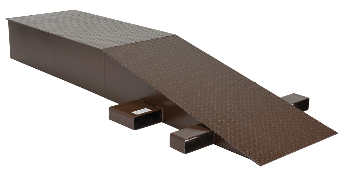 The Steel Wheel Riser is equipped with fork slots for ease in fork truck transporting. Ramps may be stacked for compact storage when not in use. Fork pockets are 7-1/2" wide by 2-1/2" high usable. These fork pockets add approximately 15" to the overall width of the riser. Wheel Risers are designed to raise the trailer for loading and unloading to facilitate compliance with OSHA/ANSI B56.1 part 3 sec 7 requirements for maximum grade of ascending or descending loaded fork trucks. Made of heavy-duty welded steel construction. Uniform capacity per pair is 40,000 lbs. (Sold Each). (1/4" thick material).