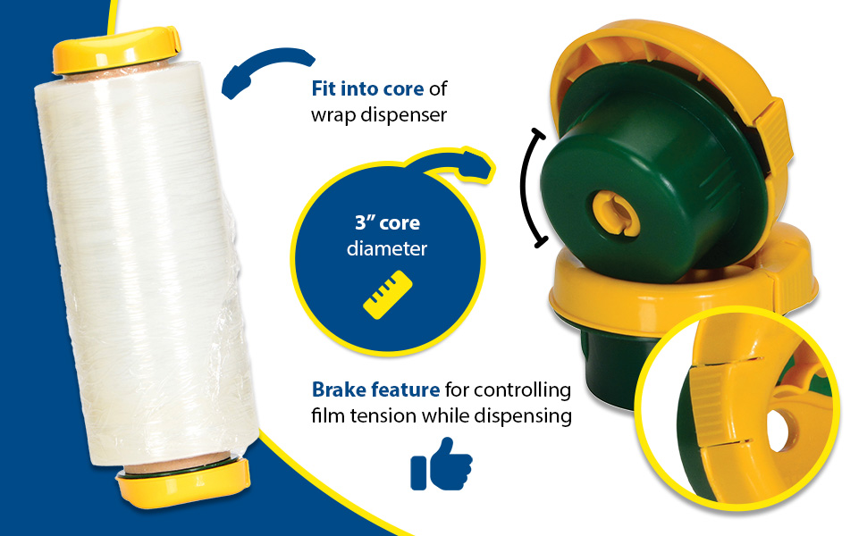 SWD-1 have easy to use fingertip units fit into core and allow for dispensing stretch wrap around your product. Brake feature included for controlling film tension while dispensing. Sold in pairs.