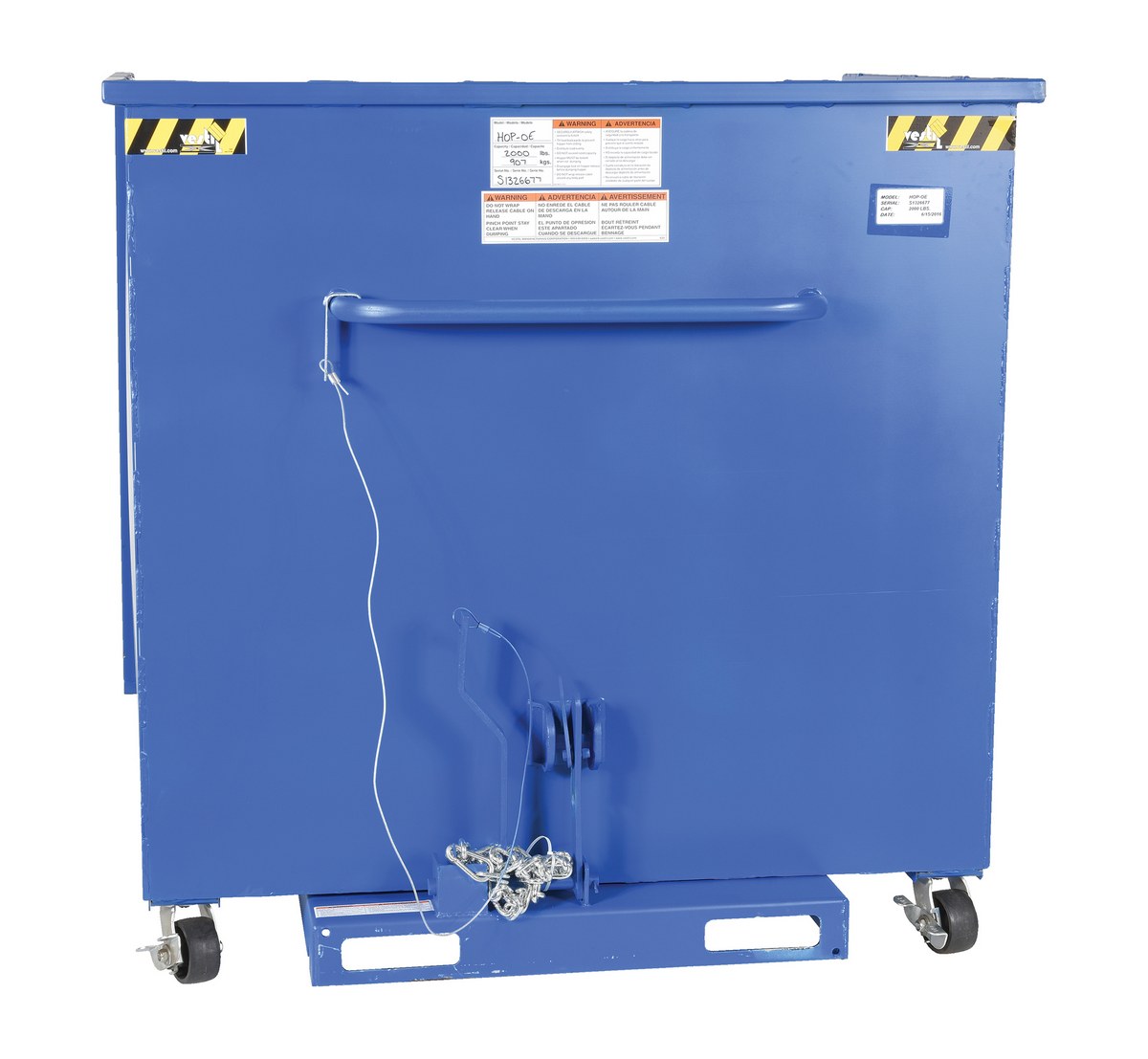 Reduce bending and lifting motions while loading items into a hopper. This hopper will allow for convenient and orderly loading at ground level with its open front design. Flat items can be loaded so more can be put into the hopper. Rolling smoothly on 4" x 2" glass filled nylon casters, the hopper can easily be moved from one location to another. Once the hopper is full or the user has finished loading, the hopper can be easily dumped with the use of a fork truck. Must be attached to a fork truck when dumping.