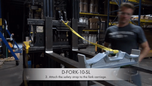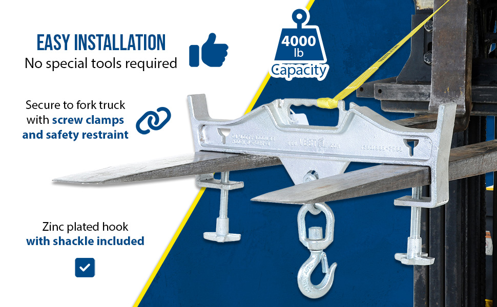 Convert your fork truck into a hook with anchor in a matter of seconds. The easy to attach Hoisting Hook does not require the assistance of special tools. Secured to the fork truck by means of a 48" long safety restraint and screw clamps. Available in single or double fork design. Units are zinc plated. Hook with shackle included. Model S-FORK-4-AT, Auto-Tension Hoisting Hook, offers a unique design and adds tension as weight is added, this unit has a yellow baked-in powder-coated toughness.