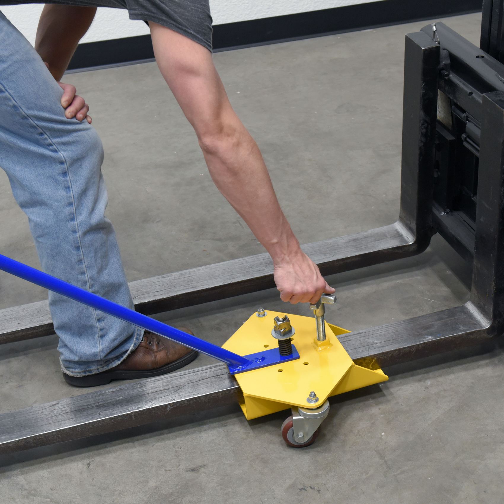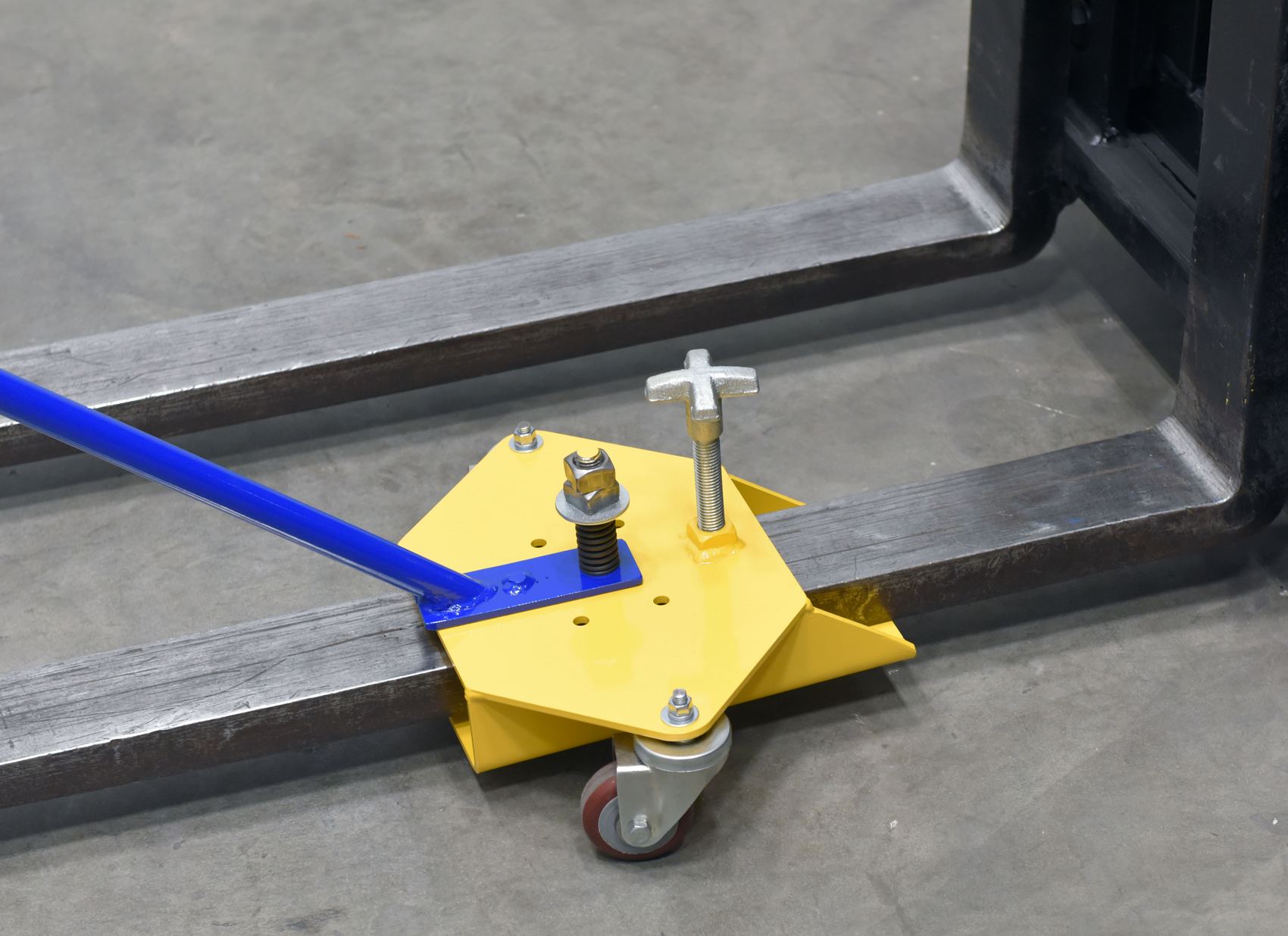 After transporting the fork to the forklift, rotate the handle 90 degrees then slide the fork onto the mast. The Fork Caddy has easy-grip handles and rolls smoothly on two swivel casters. A star knob secures the caddy onto the fork to keep it in place while transporting. The comfort-grip handle pivots up to 180 degrees to allow for easier mobility. The Fork Caddy is lightweight and small enough for easy storage as well.