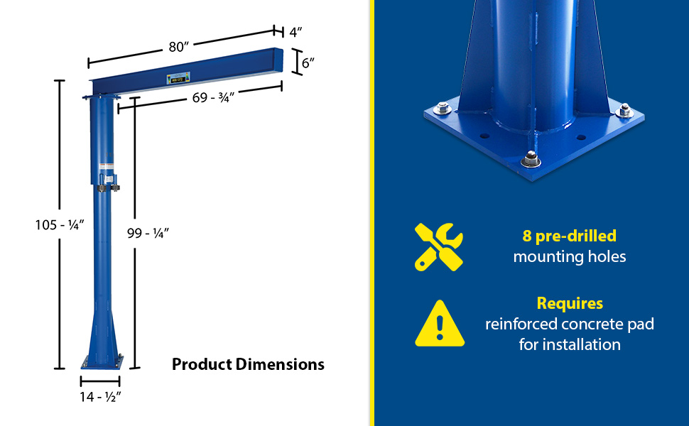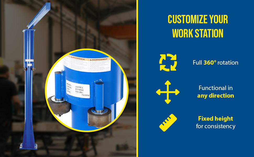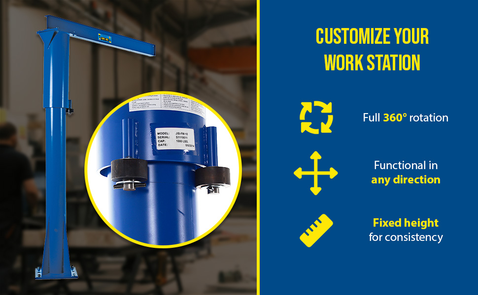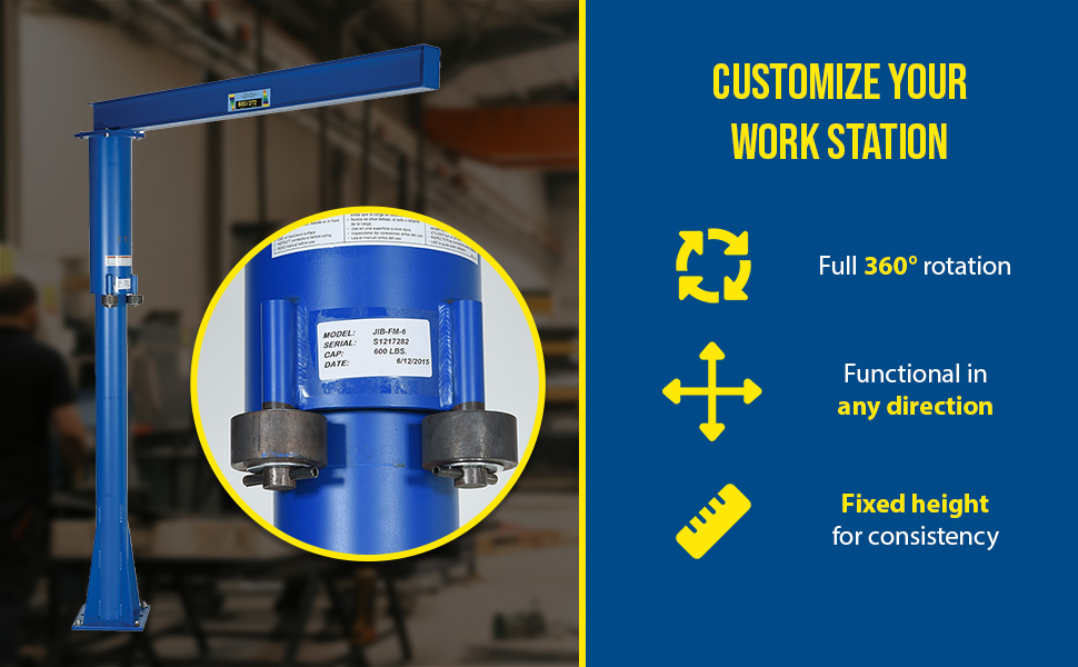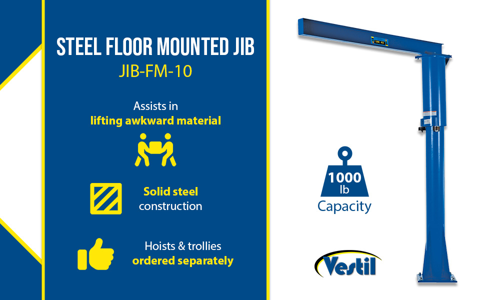 This floor mounted jib adapts well to a variety of applications. With the unique design, the job is functional in any direction or complete customization of the work station. Solid steel construction will assist workers in lifting awkward material. The overall I-beam length is 80", except for model JIB-FM-40 which has an I-beam length of 80-3/8". Hoists & Trollies can be ordered seperately.