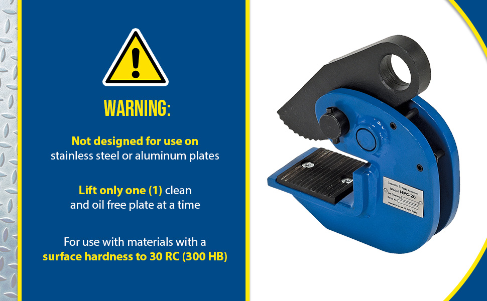 Clamp is perfectly designed for lifting plate material in horizontal positions. Heavy-duty steel construction for years of reliable use. Not designed for use on stainless steel or aluminum plates.