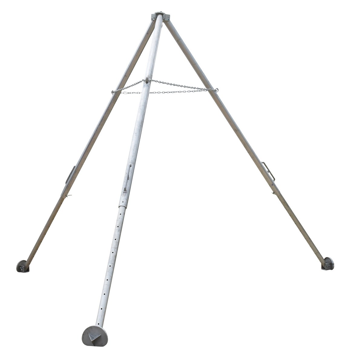 This portable steel or aluminum tripod hoist stand provides a convenient and economical lifting support stand. Available in adjustable or fixed height versions. The unit folds for convenient portability and storage. Great for access to confined spaces. Features padded pivots for smooth or spiked feet. The spiked feet are designed to be used in rough terrain. A swivel eye bolt and safety chain are standard. Chain hoist not included. Meets ANSI safety requirements for confined space Z117.1.