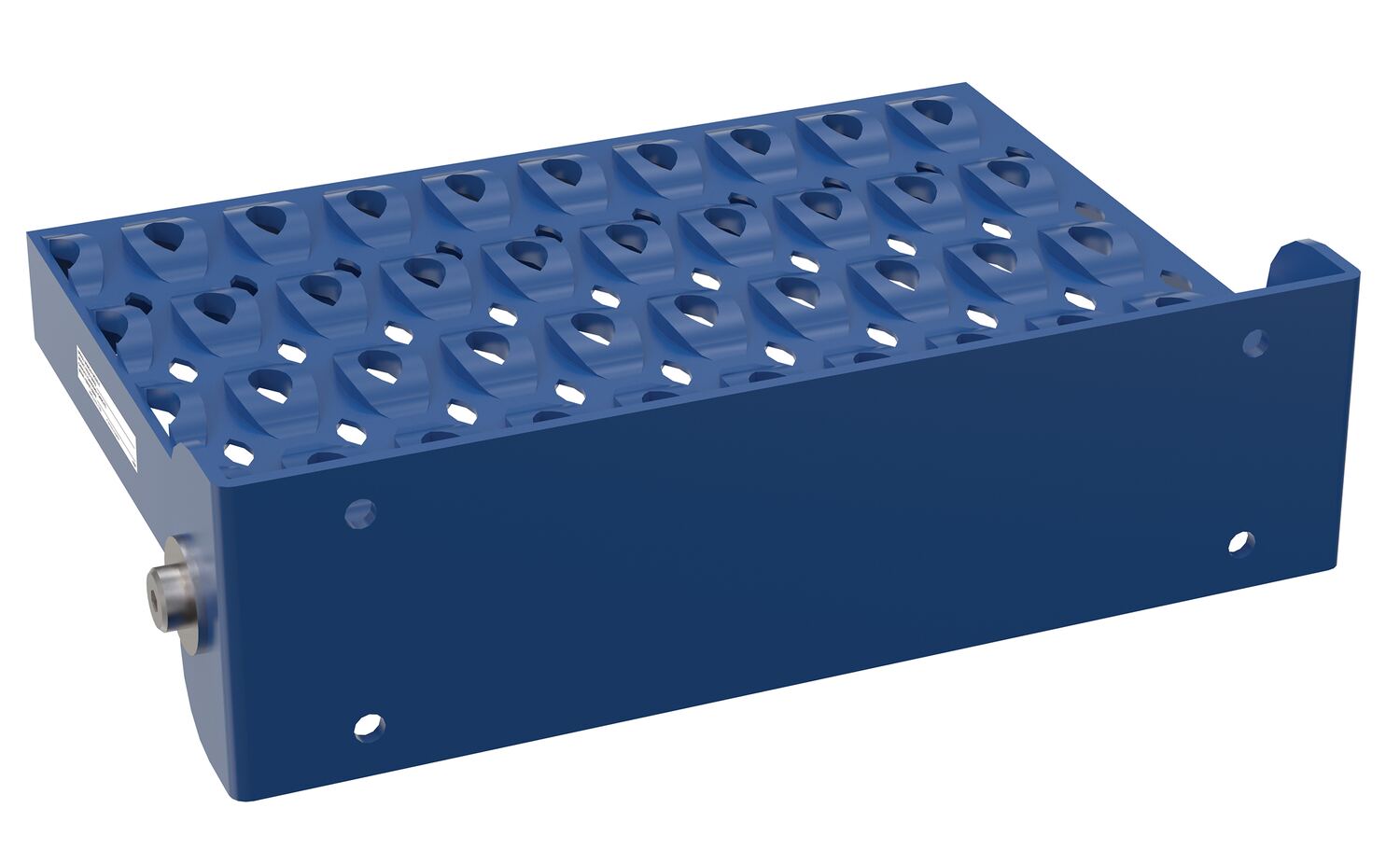 Easily rotate step to vertical position when not in use. Step is steel with powder coat blue finish and has a serrated surface for traction. Two 7/16" diameter mounting holes included. Fasteners are not included. Available in manual or spring loaded design. Baked-in powder coat blue finish for added toughness.