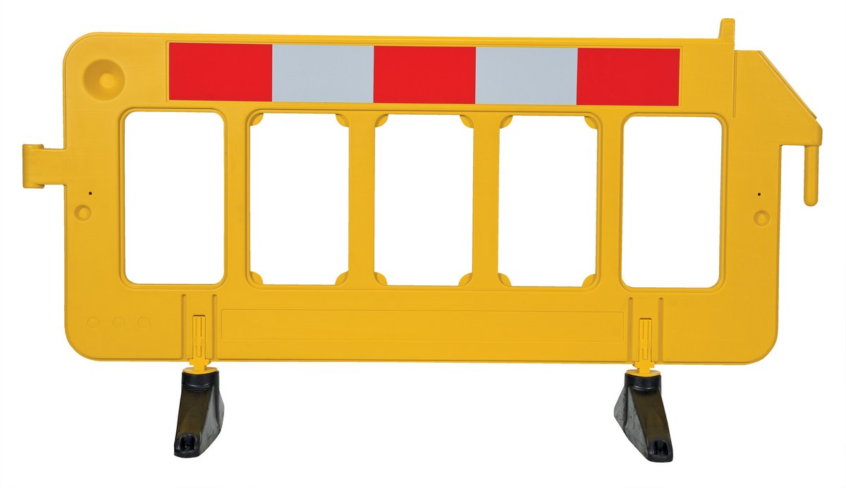 Portable barriers with removable base feet. Manufactured from virgin HDPE material and includes UV stabilizers for longer life. Top section of each barrier side includes reflective tape. Base feet are 23" long each and are manufactured from black recycled rubber.