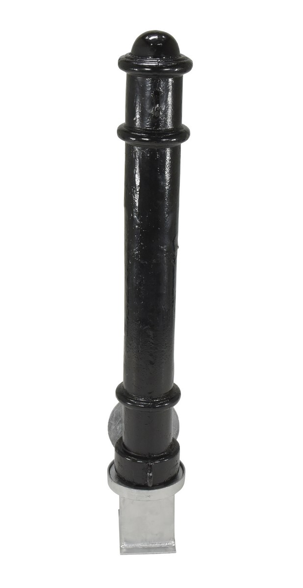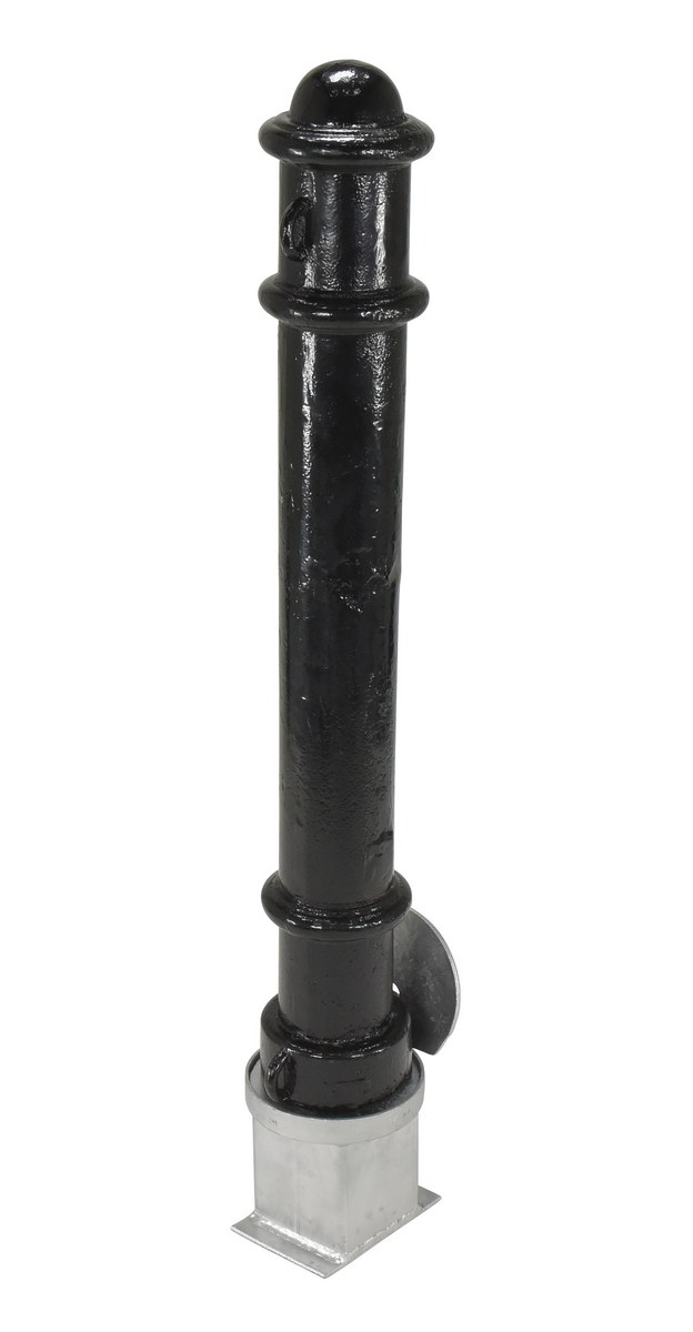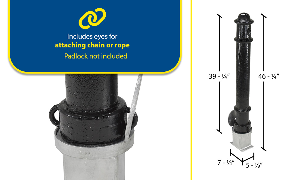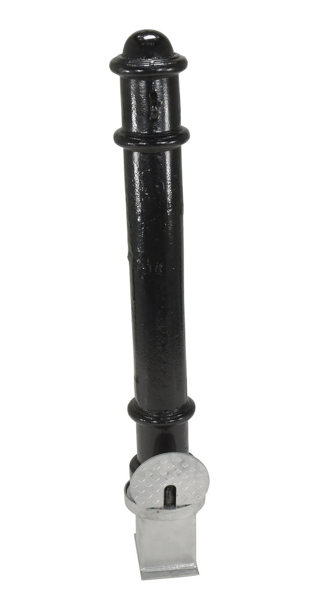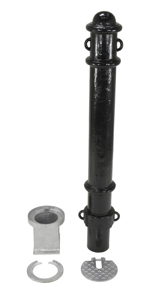 Provide an attractive yet functional barrier to vehicle access and parking. Bollards are 4-1/2" in diameter, while rings make the overall diameter 6". Padlock not included. Powder coat black finish. Includes eyes for attaching chain or rope. BOL-OR-40-BK, locks into a galvanized steel socket that is cemented into the ground. When the bollard is removed, a cover plate protects the hole leaving no protrusion above the surface. Galvanized base is included with the bollard. BOL-OR-40-BK-SM, fits into a steel socket that is bolted to ground (mounting hardware not included).