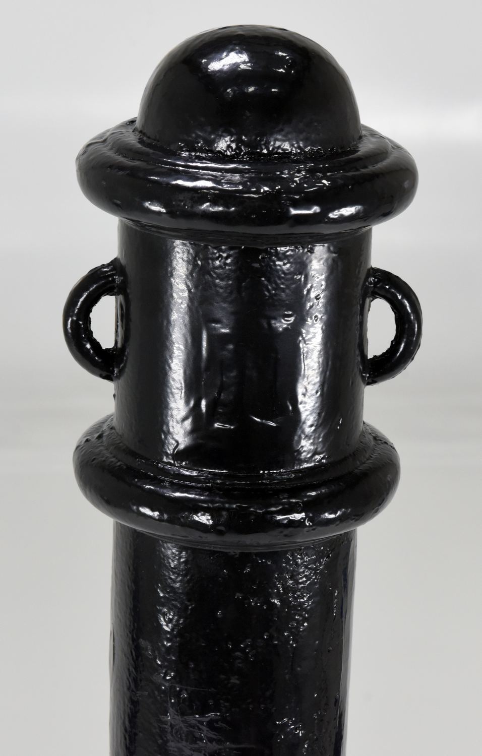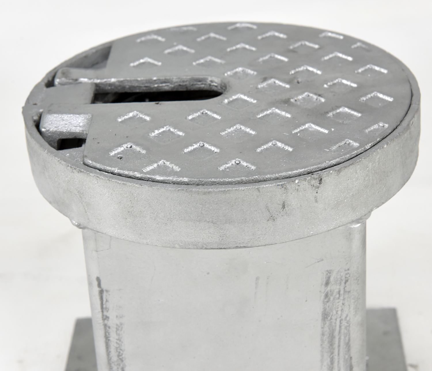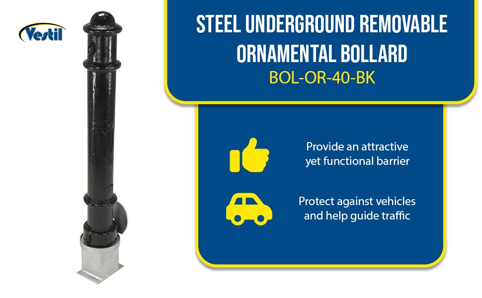 Provide an attractive yet functional barrier to vehicle access and parking. Bollards are 4-1/2" in diameter, while rings make the overall diameter 6". Padlock not included. Powder coat black finish. Includes eyes for attaching chain or rope. BOL-OR-40-BK, locks into a galvanized steel socket that is cemented into the ground. When the bollard is removed, a cover plate protects the hole leaving no protrusion above the surface. Galvanized base is included with the bollard. BOL-OR-40-BK-SM, fits into a steel socket that is bolted to ground (mounting hardware not included).