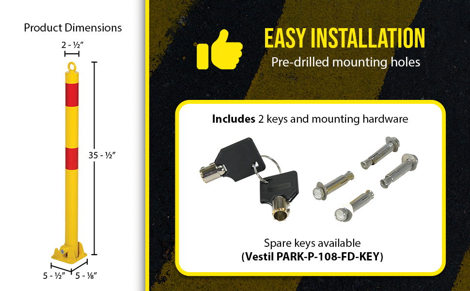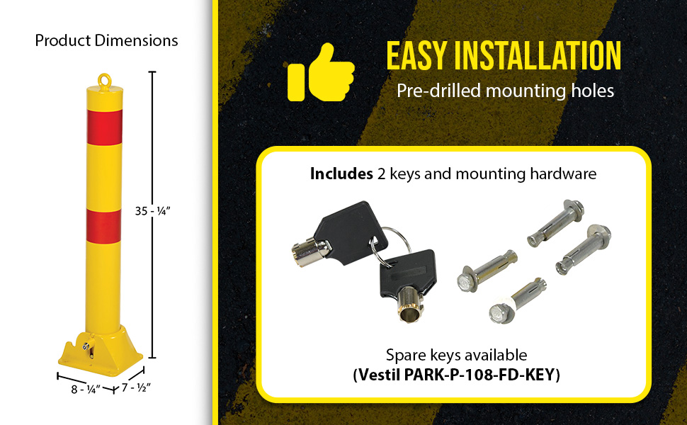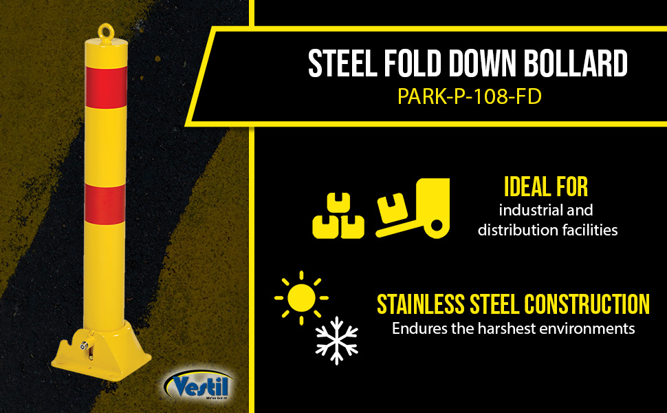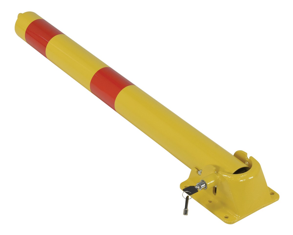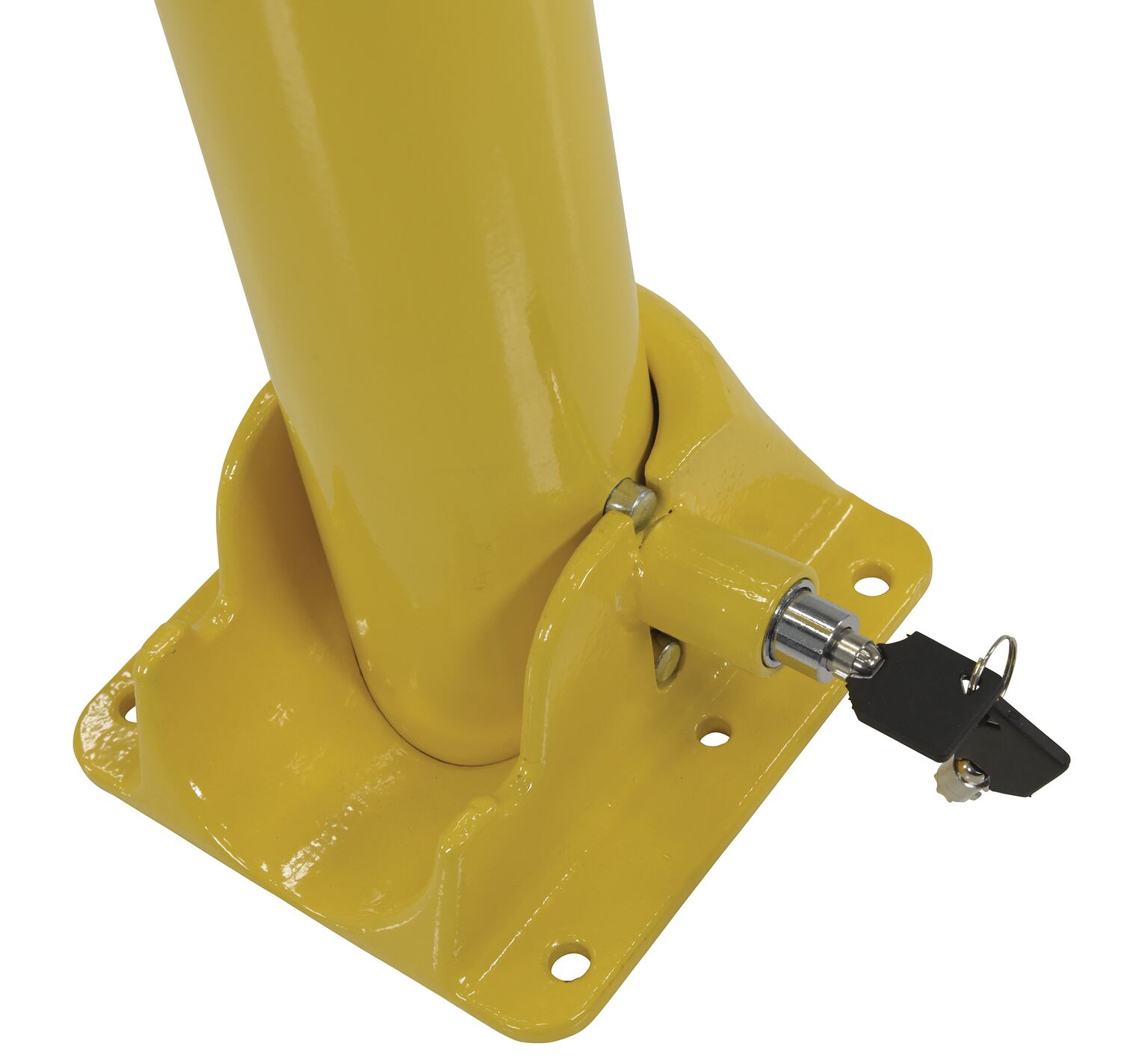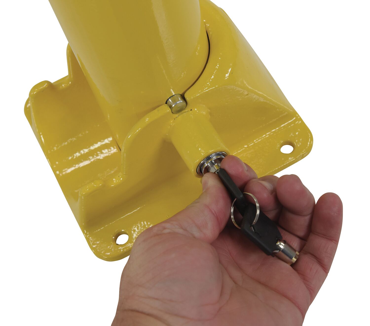 Ideal for vehicle access control. These heavy duty bollards feature integrated locking and an easy to operate cam-lock. Unit secures in open position via internal lock. Two (2) keys included. Four (4) 3/8" x 3" concrete anchors included for securing bollard to concrete. Two (2) wrap around reflectors adhere to the baked-in powder-coated toughness or stainless steel finish. The anti-tamper design and cast steel covering foot is made in a mold, therefore there are no welds. Can be used in conjunction with our Fixed Height Bollards.