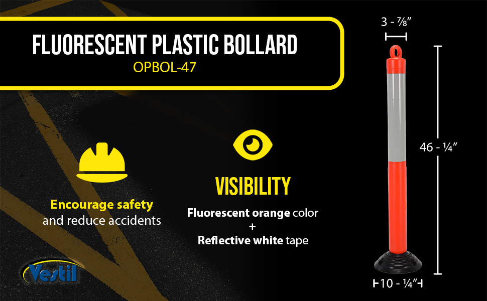 Orange Plastic Bollards are engineered for safety and the reduction of accidents. A fluorescent orange color scheme with white reflective tape promotes safety and visibility. A loop located at the top of the unit enables easy handling and is ideal for any workplace. Spring loaded for forgiveness when contact by an outside force. Base has 3 holes for mounting to surface. Hardware for mounting base is not included.