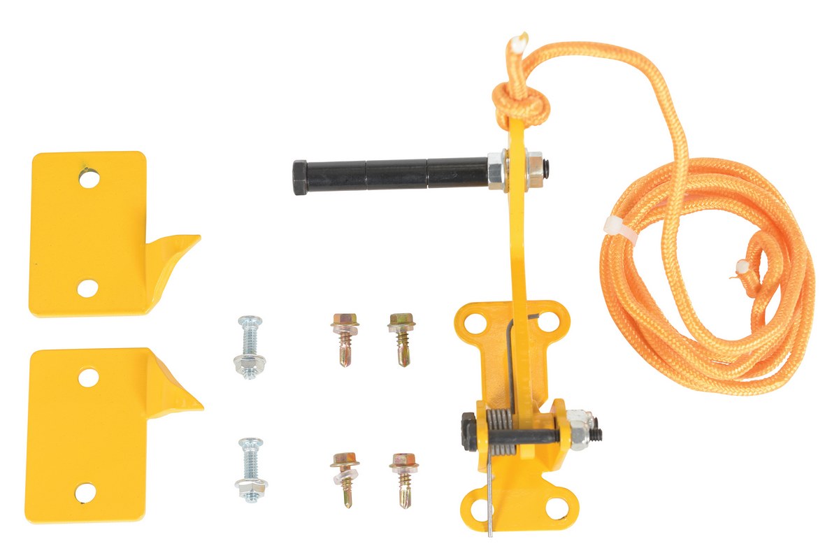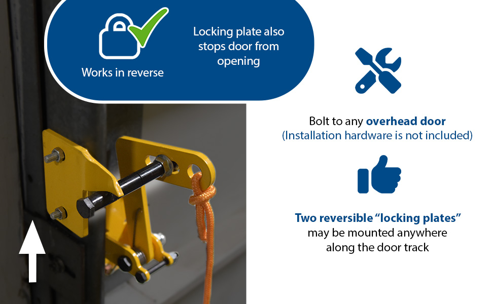 Unique product will allow overhead doors to be locked in virtually any up position. Automatically locks doors in full up position or in the closed position. Prevents the overhead door from unexpectedly "slamming down". Protects personnel, product, and equipment. Spring-loaded locking latch is released by pulling rope (included). Simply bolts to any overhead door (installation hardware is not included). Includes two reversible "locking plates" that may be mounted anywhere along door track. Steel construction with yellow baked in powder coated toughness.