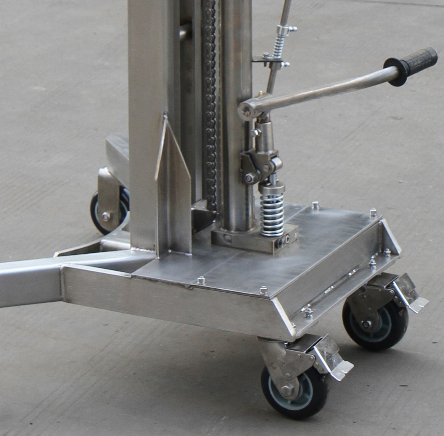 The Stainless steel hydraulic drum lifter is designed to allow the operator to load or unload drums on and off the corner of pallets. Straddle leg design allows the drum lifter to glide over standard pallets and grab most 30, 55, or 85 gallon steel and poly drums. Drums are raised and lowered easily using the foot pump. 304 grade all stainless steel construction. Ideal for washdown, pharmaceutical, and clean room applications. Highly maneuverable on two (2) rigid and two (2) swivel with brake nylon wheels. Cannot be used with fiber drums.