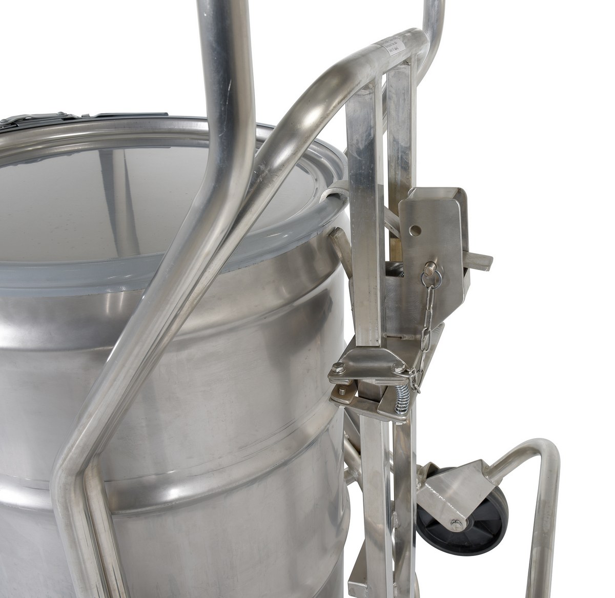 model DBT-SS, Tilt and lower drums to a horizontal position for dispensing. Grips all types of steel 30, 55, & 85 gallon drums and most rimmed plastic and fiber drums. Robust, noncorrosive design - 304 all stainless steel construction. Adjustable chime hook helps to secure the drum. Kickstand for holding the unit in stand-up position. 4-wheel design offers exceptional maneuverability through tight areas. 4-1/2" ground clearance with four (4) 8" x 2" nylon wheels.