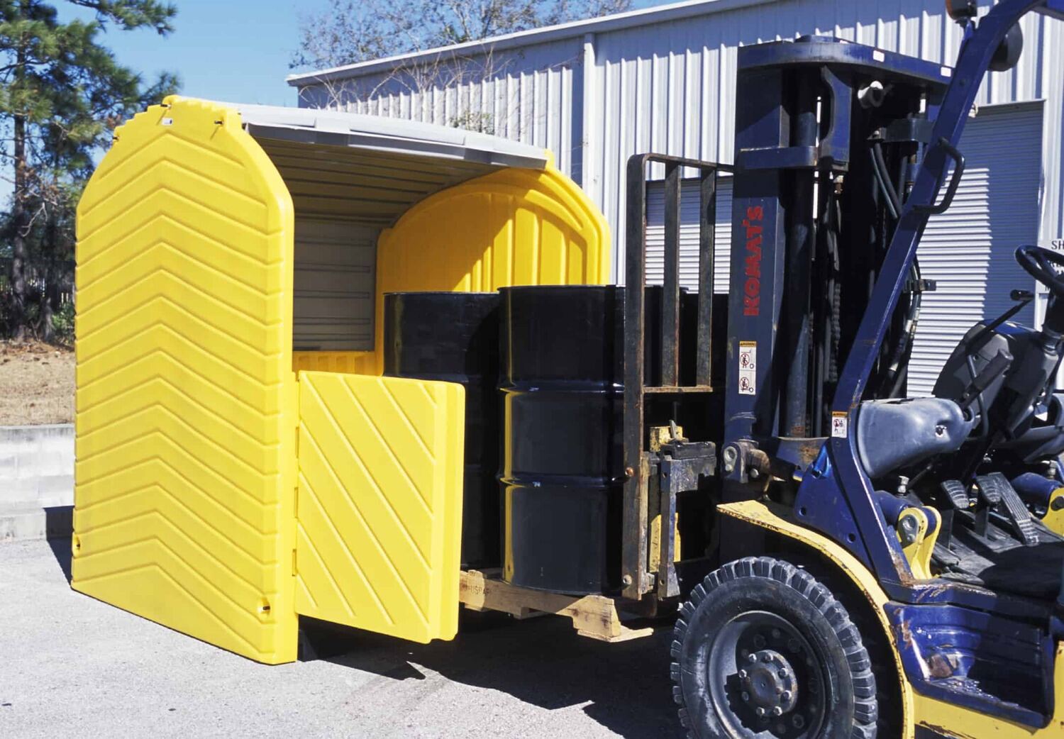 When keeping hazard and waste materials secure and out of the elements is a must, look no further than the hard-top drum storage container! A UV inhibited polyethylene construction provides a dense barrier between the contents and those unrelenting weather conditions. With a simple roll top cover and hinged doors, entrance and exit of personnel and material is without restriction. A large capacity spill pallet with drain is included for catching excess spills and leaks. Built-in fork pockets allow for a quick and easy movement between job sites! Meets EPA and Uniform Fire Code Spill Containment Regulations.