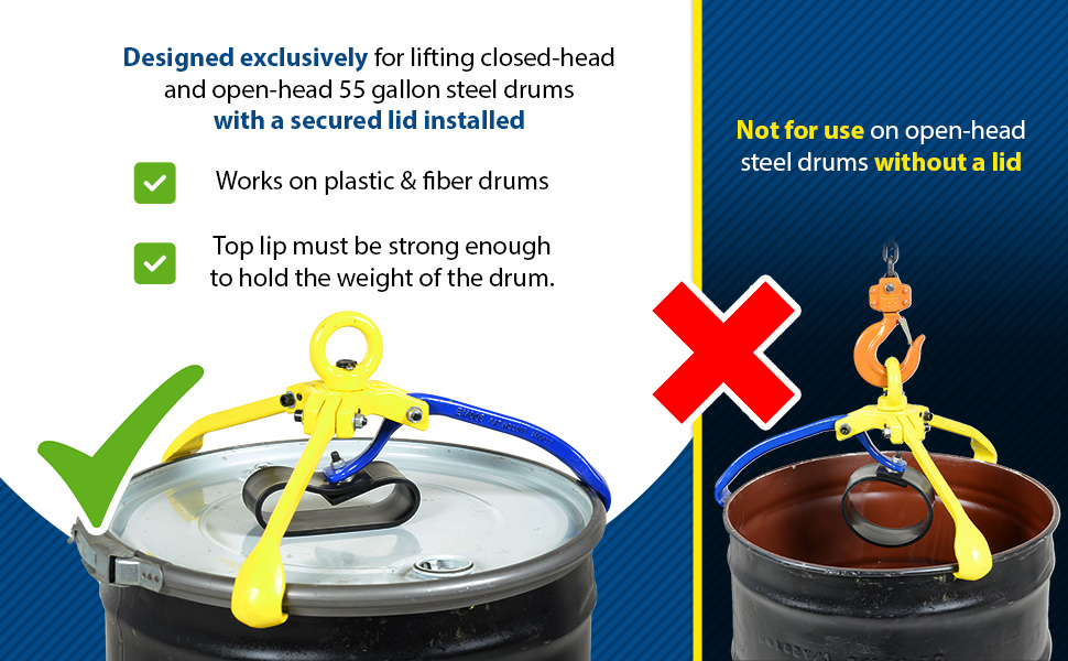 • Designed to securely lift closed & open-head 55 gallon steel drums with lid