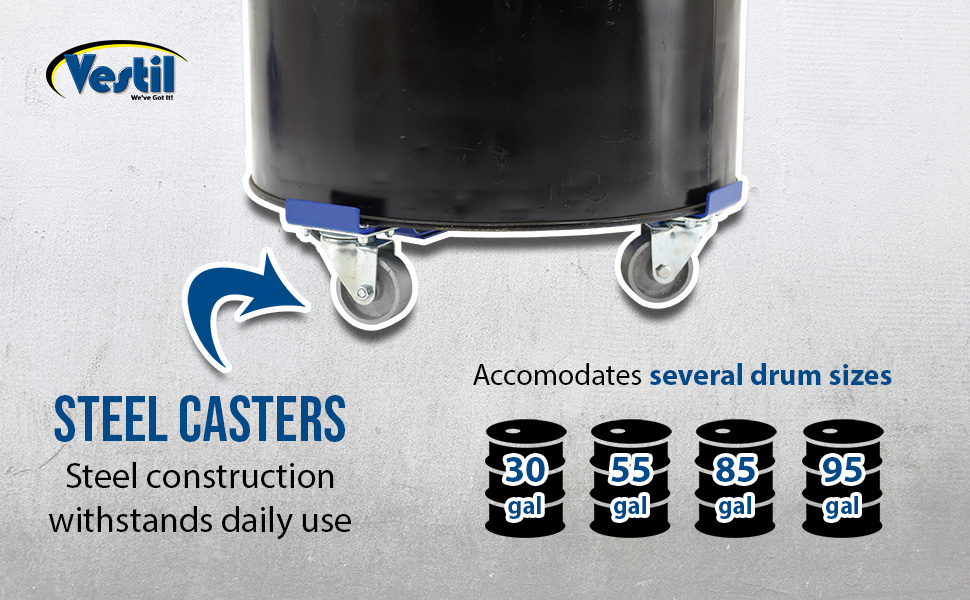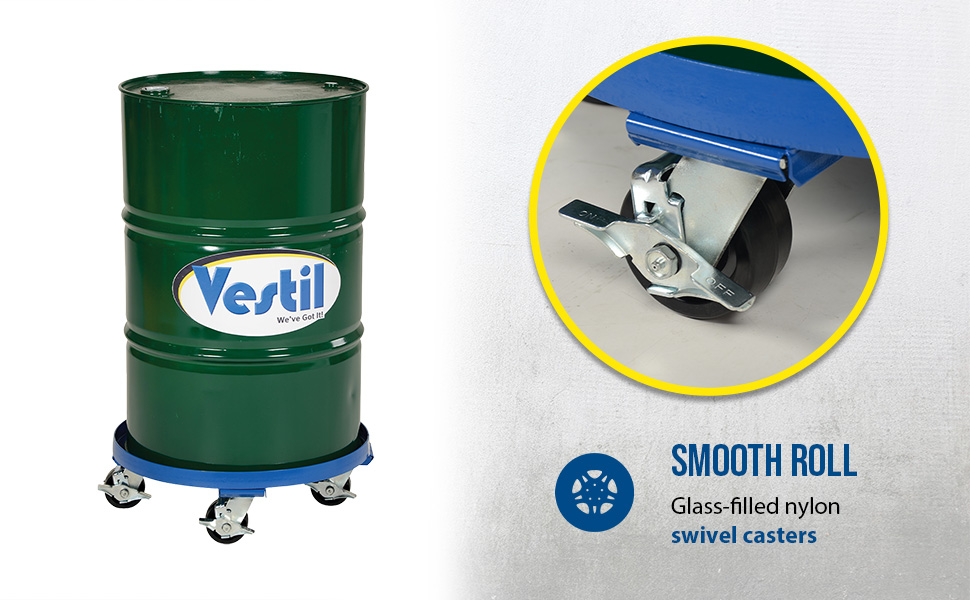 The Vestil Mobile Drum Dollies product family offers a safe, efficient, and cost-effective solution for handling, transporting, and positioning standard 30- and 55-gallon drums in industrial environments. Each dolly is engineered with a heavy-duty steel frame designed to support substantial weight capacities while maintaining easy maneuverability. Available in a range of models, these drum dollies feature durable casters that provide smooth rolling performance across various surfaces, allowing users to easily move filled drums without strain or risk of tipping. Many units include cross-supports and raised lips for added drum stability during transport, making them an essential tool for warehouses, manufacturing plants, and material handling facilities.