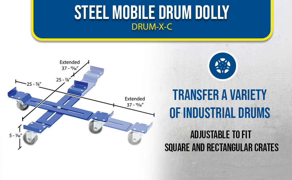 DRUM-X-C DRUM-X-CSteel Mobile Drum Dolly-Adjustable with Cast Steel Wheels 25-7/8 In. x 25-7/8 In. x 5-1/16 In. 1200 Lb. Capacity BlueUniform Capacity (lb.): 1,200