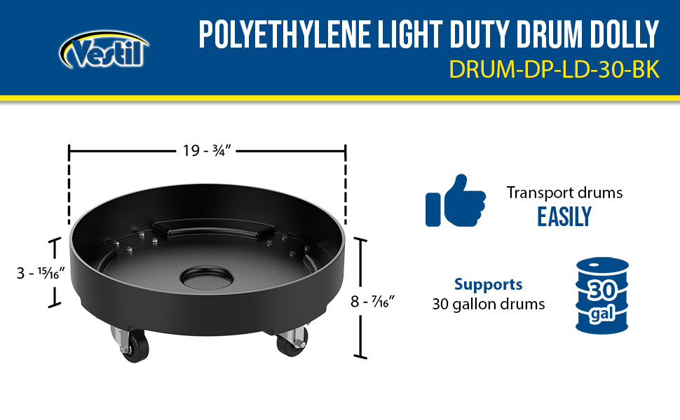 DRUM-DP-LD-30-BU DRUM-DP-LD-30-BUPolyethylene Light Duty Drum Dolly 30 Gallon 19-3/4 In. x 19-3/4 In. x 8-7/16 In. 300 Lb. Capacity BlueUniform Capacity (lb.): 300