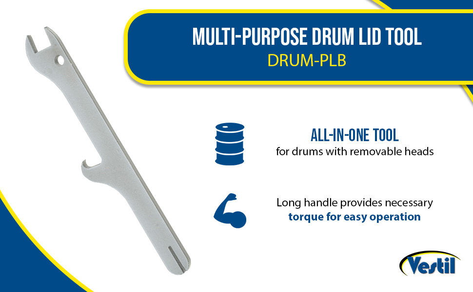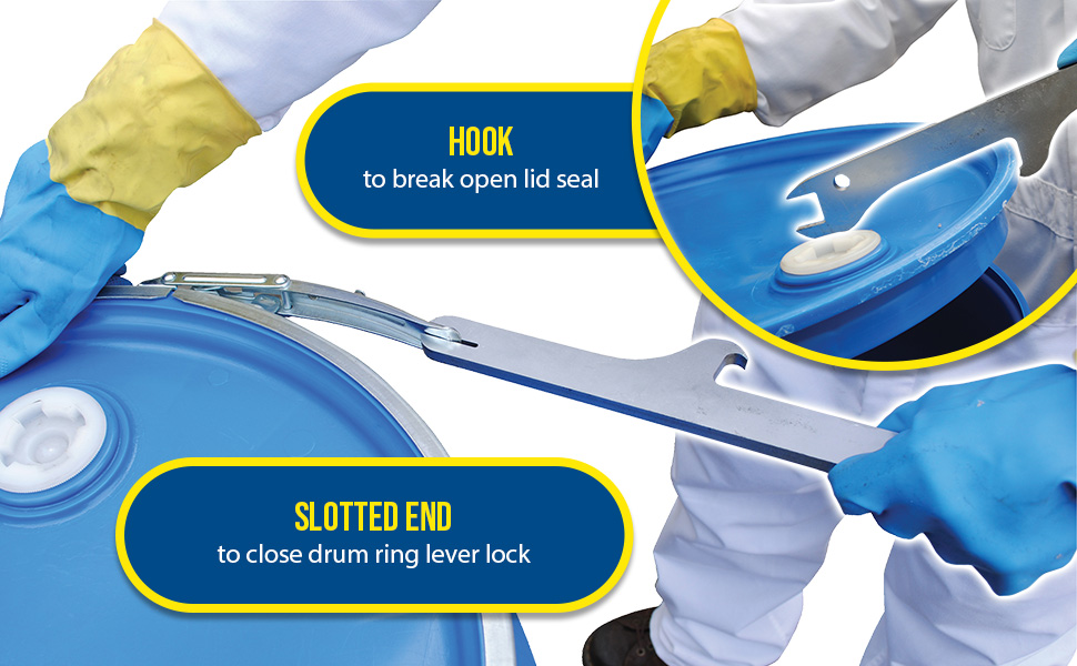 Finally an answer for opening those stubborn lids! Multi-purpose design for use with removable head steel drums. A special hook is used for breaking open-lid seals, and long handle provides adequate torque for easy operation. Integral wrench for use with removable ring bolt and nut. Slotted end used to close drum ring lever lock. Steel construction with powder coat silver finish.
