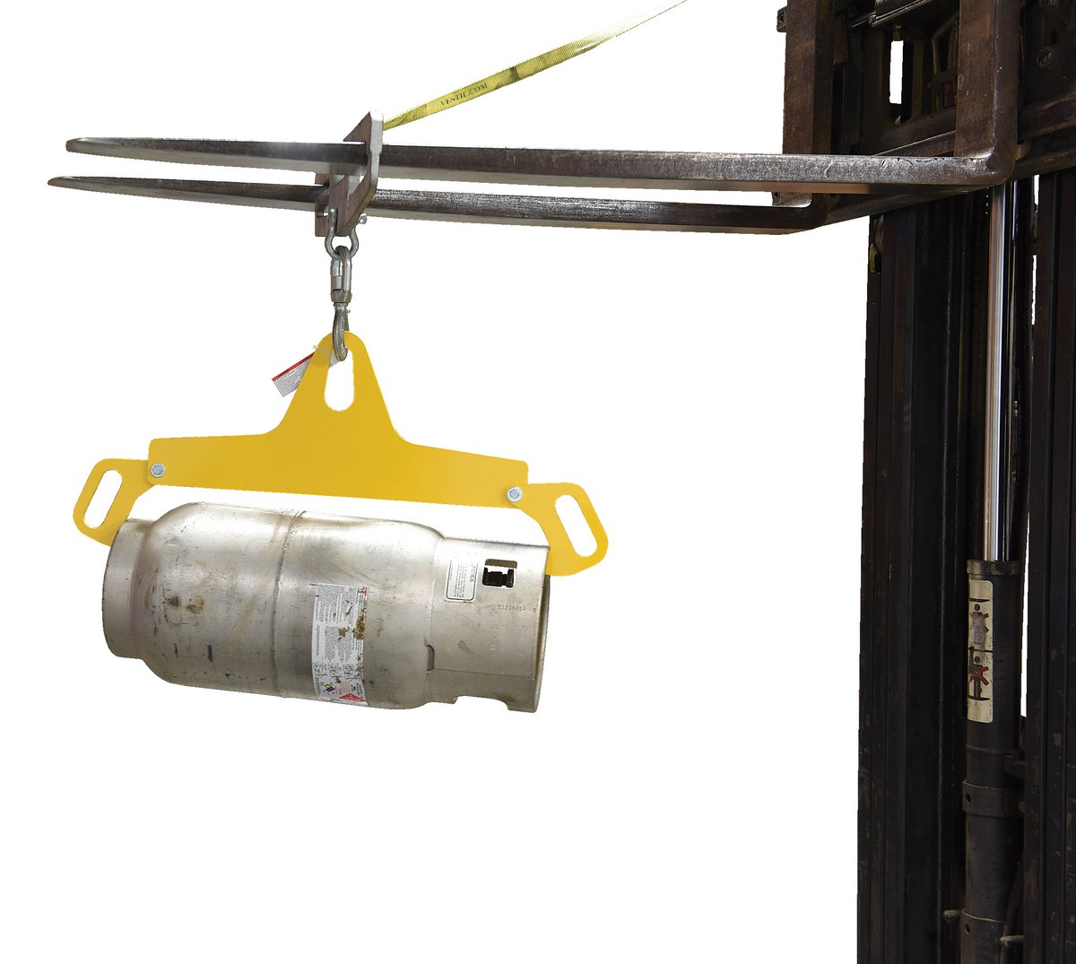 The LP Tank Lifter is a great addition to manufacturing and maintenance facilities. The lifter is constructed of powder coated steel for supreme strength and durability throughout daily use. The unit also contains a bright finish for both security and discernibility, both indoors and out. To use, simply attach the lifter to a lifting device, such as a fork truck, by utilizing the centrally located chain/hook opening. Once the unit is secured, place the arms tightly under the top and base ridges of the LP tank, lift to the desired height, and transport to the preferred location.