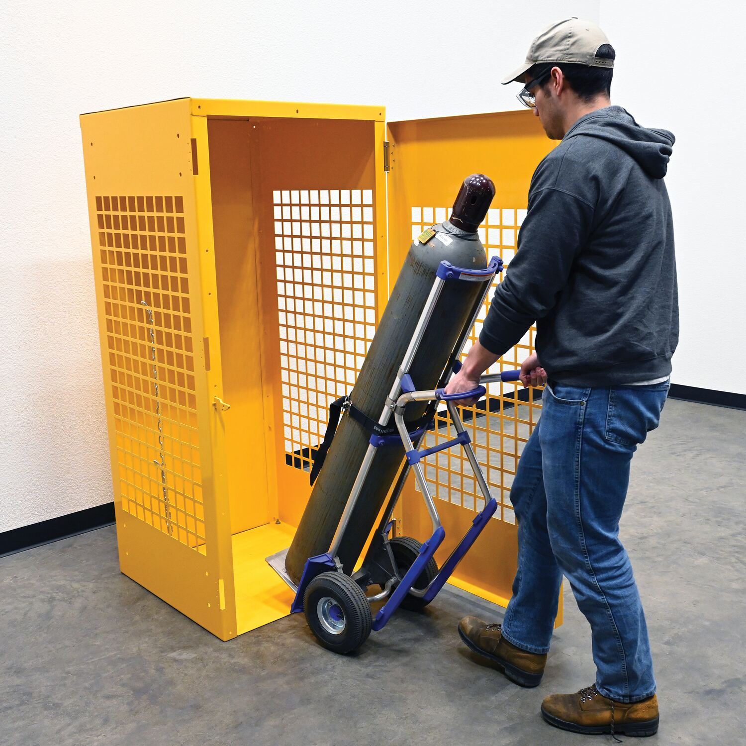 Steel cabinets for storage of cylinders. Cylinder storage capacity is based on cylinder size. Sides are made of expanded steel for an open view design. The top, back, and bottom is made of solid sheet steel. Lockable doors protect cylinders (padlock not included). Base includes lag holes for securing cylinders. Vertical units include chains for securing cylinders. Includes red lettered signage noting "Flammable-No Smoking" contents. Meets OSHA 1910.110 (f)(6)(ii), ANSI NFPA 55 + 58 and CGA P-1 design standards. Rugged steel construction with a baked-in powder coated safety yellow finish for toughness. Knock down versions available, suffix -KD Check out Vestil's Other Storage Cabinets:
